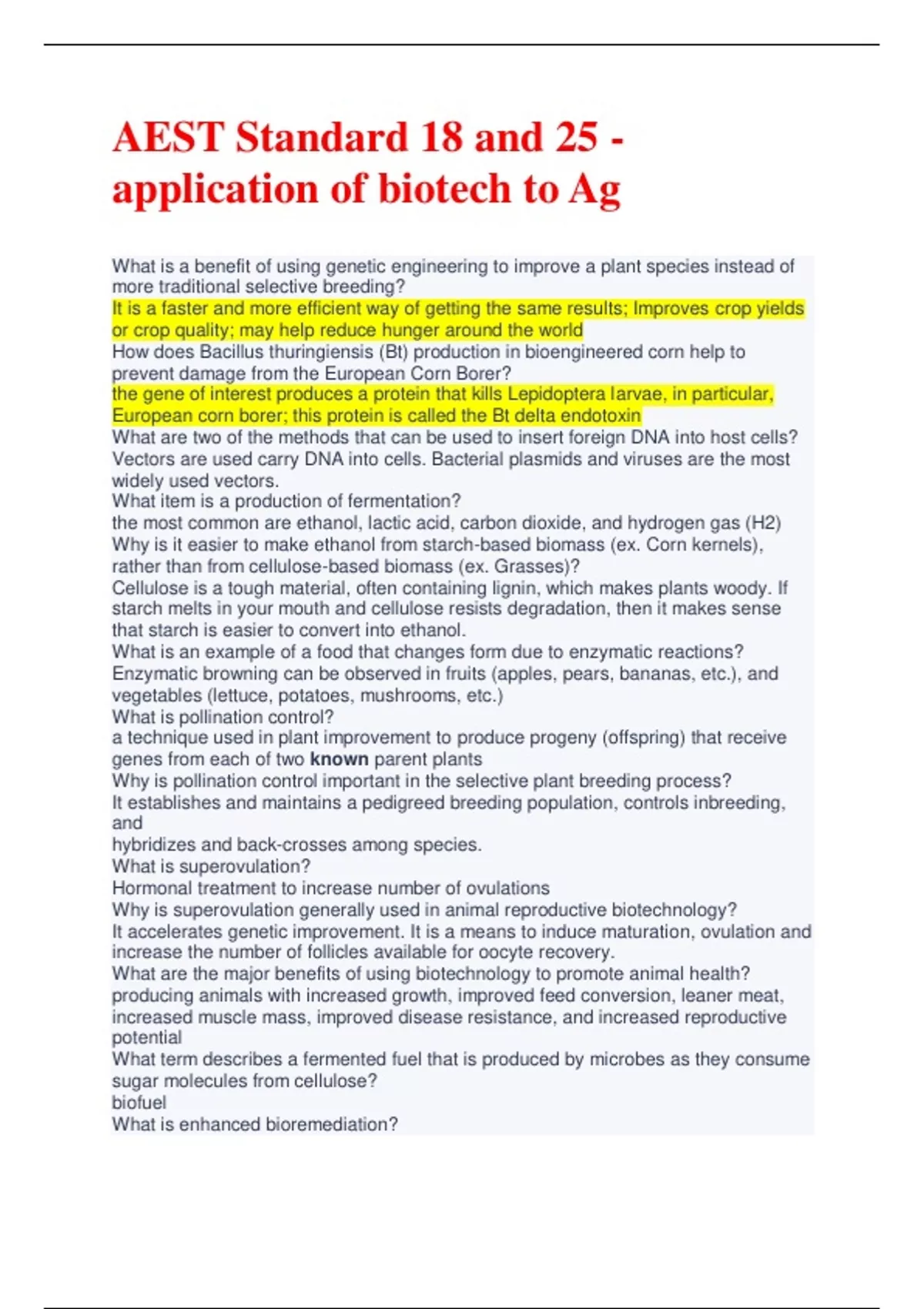 What is a benefit of using genetic engineering to improve a plant species instead of more traditional selective breeding? It is a faster and more efficient way of getting the same results; Improves crop yields or crop quality; may help reduce hunger around the world How does Bacillus thuringiensis (Bt) production in bioengineered corn help to prevent damage from the European Corn Borer? the gene of interest produces a protein that kills Lepidoptera larvae, in particular, European corn borer; this protein is called the Bt delta endotoxin What are two of the methods that can be used to insert foreign DNA into host cells? Vectors are used carry DNA into cells. Bacterial plasmids and viruses are the most widely used vectors. What item is a production of fermentation? the most common are ethanol, lactic acid, carbon dioxide, and hydrogen gas (H2) Why is it easier to make ethanol from starch-based biomass (ex. Corn kernels), rather than from cellulose-based biomass (ex. Grasses)? Cellulose is a tough material, often containing lignin, which makes plants woody. If starch melts in your mouth and cellulose resists degradation, then it makes sense that starch is easier to convert into ethanol. What is an example of a food that changes form due to enzymatic reactions? Enzymatic browning can be observed in fruits (apples, pears, bananas, etc.), and vegetables (lettuce, potatoes, mushrooms, etc.) What is pollination control? a technique used in plant improvement to produce progeny (offspring) that receive genes from each of two known parent plants Why is pollination control important in the selective plant breeding process? It establishes and maintains a pedigreed breeding population, controls inbreeding, and hybridizes and back-crosses among species. What is superovulation? Hormonal treatment to increase number of ovulations Why is superovulation generally used in animal reproductive biotechnology? It accelerates genetic improvement. It is a means to induce maturation, ovulation and increase the number of follicles available for oocyte recovery. What are the major benefits of using biotechnology to promote animal health? producing animals with increased growth, improved feed conversion, leaner meat, increased muscle mass, improved disease resistance, and increased reproductive potential What term describes a fermented fuel that is produced by microbes as they consume sugar molecules from cellulose? biofuel What is enhanced bioremediation?