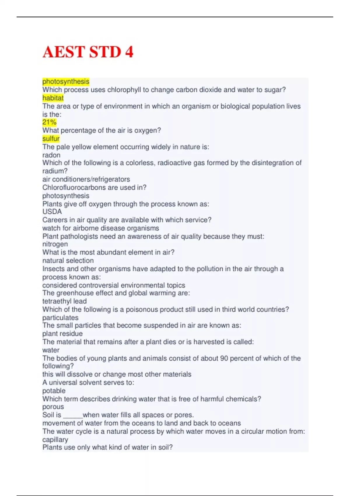 photosynthesis Which process uses chlorophyll to change carbon dioxide and water to sugar? habitat The area or type of environment in which an organism or biological population lives is the: 21% What percentage of the air is oxygen? sulfur The pale yellow element occurring widely in nature is: radon Which of the following is a colorless, radioactive gas formed by the disintegration of radium? air conditioners/refrigerators Chlorofluorocarbons are used in? photosynthesis Plants give off oxygen through the process known as: USDA Careers in air quality are available with which service? watch for airborne disease organisms Plant pathologists need an awareness of air quality because they must: nitrogen What is the most abundant element in air? natural selection Insects and other organisms have adapted to the pollution in the air through a process known as: considered controversial environmental topics The greenhouse effect and global warming are: tetraethyl lead Which of the following is a poisonous product still used in third world countries? particulates The small particles that become suspended in air are known as: plant residue The material that remains after a plant dies or is harvested is called: water The bodies of young plants and animals consist of about 90 percent of which of the following? this will dissolve or change most other materials A universal solvent serves to: potable Which term describes drinking water that is free of harmful chemicals? porous Soil is _____when water fills all spaces or pores. movement of water from the oceans to land and back to oceans The water cycle is a natural process by which water moves in a circular motion from: capillary Plants use only what kind of water in soil?