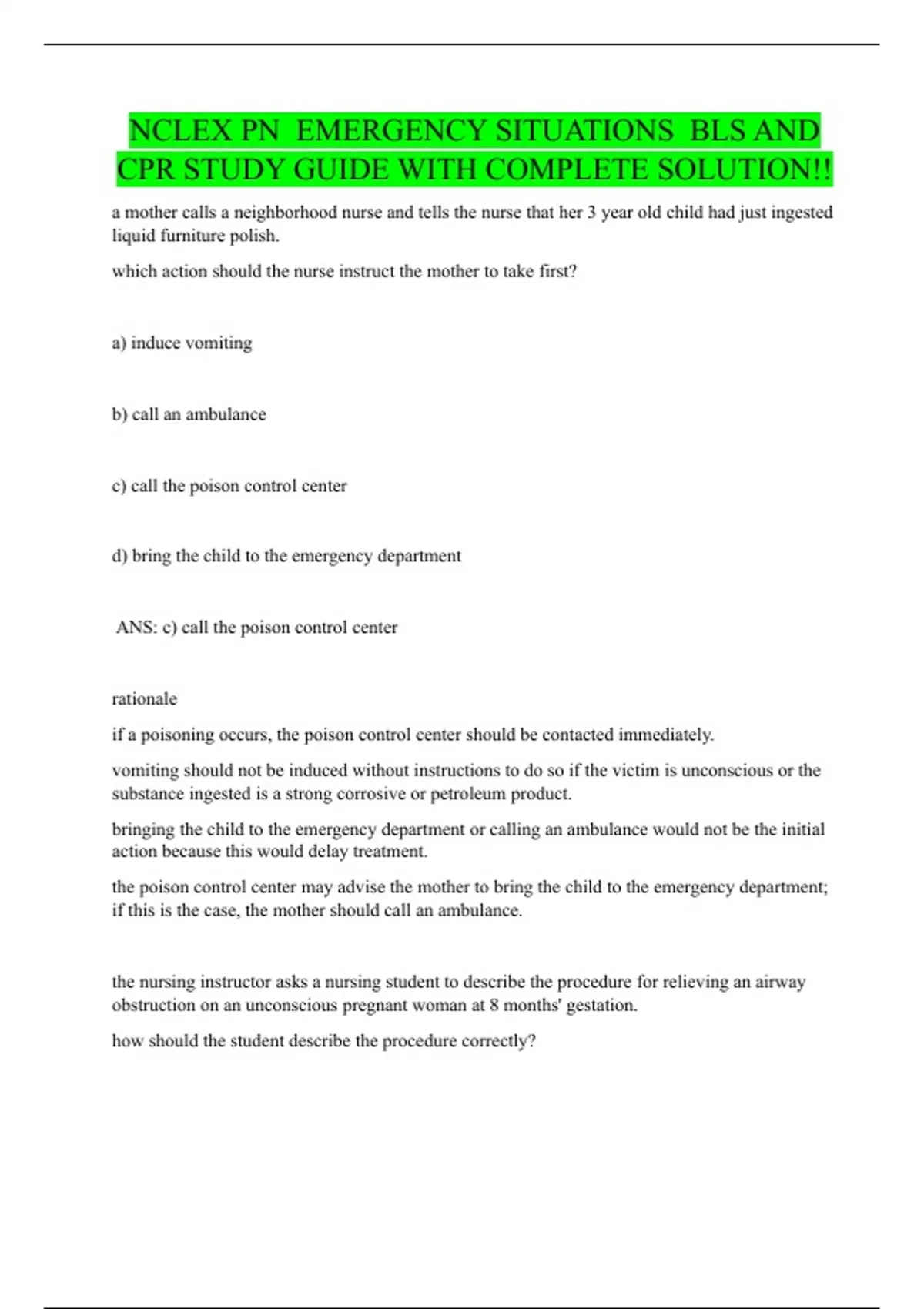NCLEX PN - EMERGENCY SITUATIONS / BLS AND CPR STUDY GUIDE WITH COMPLETE SOLUTION!!