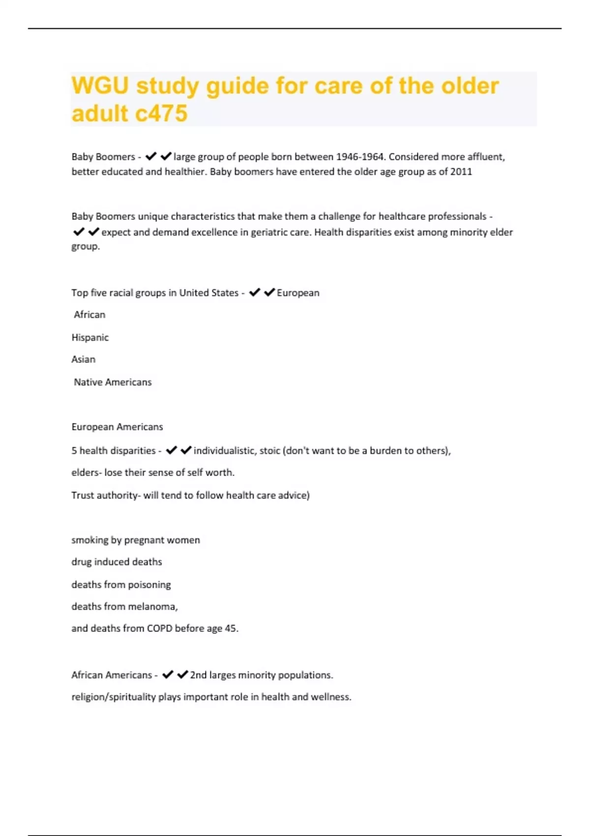 Baby Boomers - large group of people born between . Considered more affluent, better educated and healthier. Baby boomers have entered the older age group as of 2011 Baby Boomers unique characteristics that make them a challenge for healthcare professionals - expect and demand excellence in geriatric care. Health disparities exist among minority elder group. Top five racial groups in United States - European African Hispanic Asian Native Americans European Americans 5 health disparities - individualistic, stoic (don't want to be a burden to others), elders- lose their sense of self worth. Trust authority- will tend to follow health care advice) smoking by pregnant women drug induced deaths deaths from poisoning deaths from melanoma, and deaths from COPD before age 45. African Americans - 2nd larges minority populations. religion/spirituality plays important role in health and wellness.Equate good luck, good fortune, and good health with being right with God. Closer ties with extended families and rely on their close family ties for support. Distrustful of health care personnel African Americans - top five health disparities - gonorrhea, congenital syphilis, new cases of AIDS, deaths due to HIV infection. Hispanic Americans - high values on family, religion, and community. family interdependence over independence. family first before seeking outside health care. homeopathic remedies in conjunction with religious artifacts before engaging the health care professional. They disagree with silence and noncompliance. May not seek health care because they feel that their illness/disease is a punishment of sins. Many do not seek health care because they do not have access to it (lack of insurance, communication difficulties, or fear of ramifications due to being in country illegally. Diabetes and heart disease are two health problems that have increased within this cultural group Hispanic Americans - top 5 health disparities - congenital syphilis TB, AIDS,exposure to particulate matter, cirrhosis deaths Asian Americans - still practice holistic (naturalistic) medicine and may incorporate this as an adjunct to Western medicine.