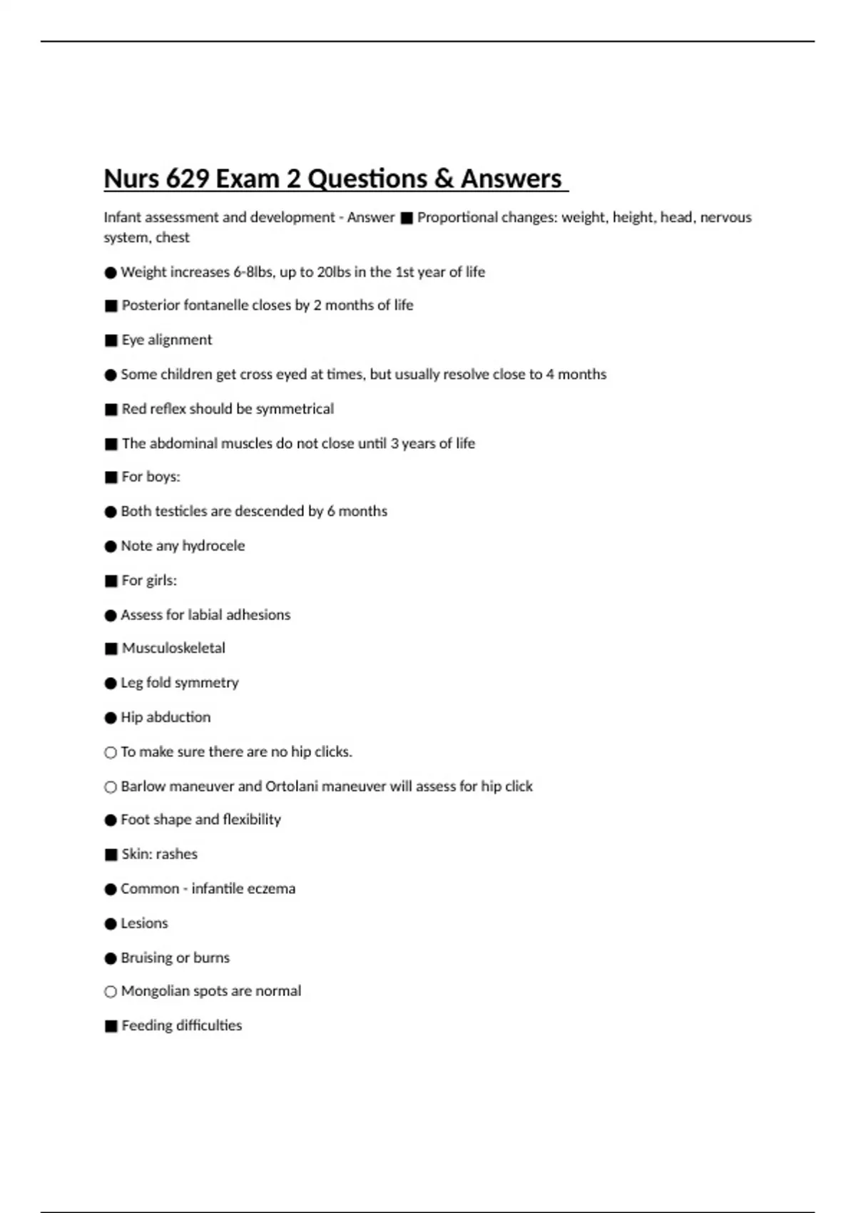 Infant assessment and development - Answer ■ Proportional changes: weight, height, head, nervous system, chest ● Weight increases 6-8lbs, up to 20lbs in the 1st year of life ■ Posterior fontanelle closes by 2 months of life ■ Eye alignment ● Some children get cross eyed at times, but usually resolve close to 4 months ■ Red reflex should be symmetrical ■ The abdominal muscles do not close until 3 years of life ■ For boys: ● Both testicles are descended by 6 months ● Note any hydrocele ■ For girls: ● Assess for labial adhesions ■ Musculoskeletal ● Leg fold symmetry ● Hip abduction ○ To make sure there are no hip clicks. ○ Barlow maneuver and Ortolani maneuver will assess for hip click ● Foot shape and flexibility ■ Skin: rashes ● Common - infantile eczema ● Lesions ● Bruising or burns ○ Mongolian spots are normal ■ Feeding difficulties ● Regurgitation and spitting-up ○ Acid reflux is prevalent d/t sphincters are not mature ○ Encourage parents to break up feeding after ~15mL. burp the child and then return to feeding ○ Spitting up can be large amount and it is normal for it to come out of the nose ● Colic ○ Common during newborn period, usually resolves by 6 months of life Toddler development - Answer ■ Toddler ● Weight gain 4-6lbs per year ● Height: 3 inches per year ● Visual acuity 20/40 ● Brain growth is 75% completed ● Respiratory tract is rapidly developing closer to that of an adult, but still anatomically is much smaller. ● Immune system is weakened, increased risk for any kind of complications ● Measurements: height, weight, head circumference up until 2 years of age ● Physical exam ○ HEENT ■ Anterior fontanel - make sure it is getting smaller and closing ● It usually closes by 18 months - 2 years ■ Screen for strabismus ■ Look for tooth eruption and/or dental decay ● If by 18 months they do not have a first tooth eruption, order x-ray ○ Musculoskeletal ■ Assess for hip dysplasia, gait, out-toeing, bowlegged ○ Neurological ■ Deep tendon reflex ■ Babinski Preschool development and assessment - Answer ● Weight gain 5 lbs/year ● Height 2-3 inches/year ● Head circumference, no needed since the anterior fontanelle should have closed 18 months - 2 years ● Screening: vision and hearing School age children development/ assessment - Answer ■ Slow but steady growth ● Height: increases 2 in/year ● Weight: 4 ½ - 6 ½ lbs/year ● Skeletal lengthening & fat diminution ● Strength increases yet muscles remain functionally immature ● Start to lose those primary teeth and develop their permanent teeth ● GI system, cardiovascular system becomes that of an adult ● Bladder capacity increases ● Immune system improves ● Bones become hard and they are not as pliable as it was in the early ages ● Prepubescent ● Vital signs: approaching adult values by the end of the school age ○ Blood pressure ○ Vision screening ○ Hearing screening Adolescence development and assessment - Answer ■ Extremities grow faster than trunk and head ■ Facial proportions change ● Nose and chin enlarge first ■ Figure changes ● Pelvis enlarges in females ● Shoulders enlarge in male ■ Subcutaneous fat increases ■ Increased function of sweat glands ■ Increased function of sebaceous glands ■ Puberty begins ● Girls: 9-13 years ● Boys: 11-14 years ■ Girls ● Breast enlargement begins 8-13 years ● Axillary hair develops 11-13 years ● Pubic hair develops 10-12 years ● Menarche begins 10-16 years ■ Boys ● Genital enlargement begins 9-13 years ● Axillary hair begins 12-14 years ● Facial hair develops 11-14 years ● Pubic hair develops 12-15 years ■ Physical Exam ● Vitals, height & weight with BMI ● Head to toe examinations ○ Acne ○ Athletic teens may have lower heart rate ○ Changes related to puberty - including Tanner staging Neonate milestones and red flags - Answer Milestones Strong reflexes. Minimum of 6-8 bowel movements per day. Urinates 8 times a day Red flags Jaundice at birth (hemolysis). High-pitched cry. Irritable. "Floppy" (hypotonic). Poor reflexes 3 month old mile stones and red flags - Answer Milestones Smiles. Able to coo. Makes gurgling sounds. Can hold head up. Starts to recognize parents. Crawls. Red flags Inability to hold head up. Avoids eye contact. Floppy. 6 month old milestones and red flags - Answer Milestones Sits up without support. Rolls in both directions (front to back, back to front). Says single-syllable sounds "ba, da, ma." Tries to get things out of reach by "raking" (uses palms to reach). Red flags Lack of babbling. Does not laugh. Inability to turn head past midline (180 degrees). 9 month old milestones and red flags - Answer Milestones Pincer grasp (fine motor). Plays "pat a cake" and "peek-a-boo." Says "good-bye." May be afraid of strangers (can be clingy). Can stand holding on. Red flags Infantile reflexes strong. Persistence of primitive reflexes (startle, fencing, etc.). does not babble. Does not bear weight on legs with support. Unable to site with help. 1 year milestones and red flags - Answer Milestones Supports own weight. Walks with hands held. Parallel play. Separation anxiety. Can "climb" stairs by crawling up or down. Starts to cruise (moves from one piece of furniture to the other for support). Red flags Unable to support own weight. Lack of babbling. No response to smiles, poor eye contact, loss of previously learned skills (autism). 2 years milestones and red flags - Answer Milestones Walks. Runs. Climbs stair up and down on own by holding onto handrails. Speech mostly understood by family. Follows two or three step instructions. Copies a line. Red flags Unable to speak meaningful two-word "sentences." Does not understand simple commands. Loss of speech, social skills, previously learned behaviors and/or does not say words by 16 months (autism). 3 years old milestones and red flags - Answer Milestones Spe