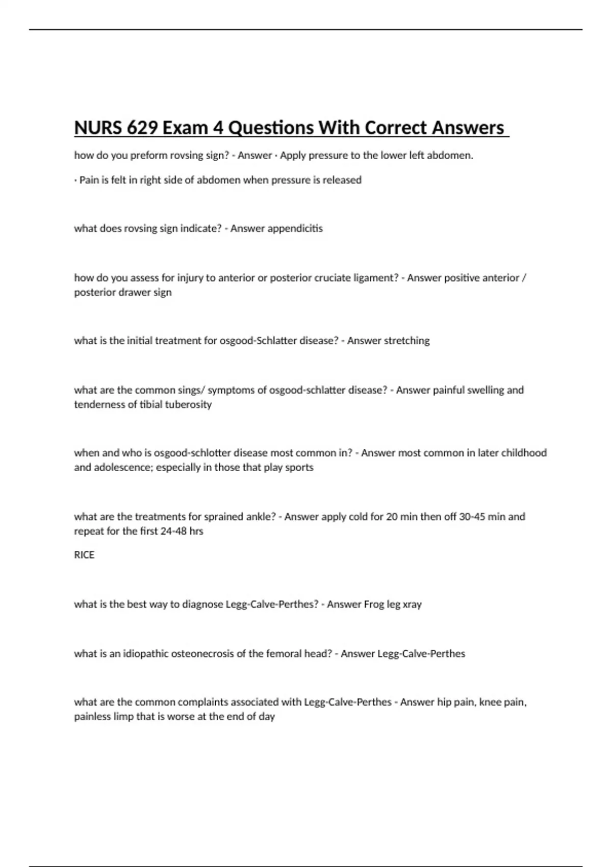 how do you preform rovsing sign? - Answer · Apply pressure to the lower left abdomen. · Pain is felt in right side of abdomen when pressure is released what does rovsing sign indicate? - Answer appendicitis how do you assess for injury to anterior or posterior cruciate ligament? - Answer positive anterior / posterior drawer sign what is the initial treatment for osgood-Schlatter disease? - Answer stretching what are the common sings/ symptoms of osgood-schlatter disease? - Answer painful swelling and tenderness of tibial tuberosity when and who is osgood-schlotter disease most common in? - Answer most common in later childhood and adolescence; especially in those that play sports what are the treatments for sprained ankle? - Answer apply cold for 20 min then off 30-45 min and repeat for the first 24-48 hrs RICE what is the best way to diagnose Legg-Calve-Perthes? - Answer Frog leg xray what is an idiopathic osteonecrosis of the femoral head? - Answer Legg-Calve-Perthes what are the common complaints associated with Legg-Calve-Perthes - Answer hip pain, knee pain, painless limp that is worse at the end of day what is the most common complication of gastroenteritis? - Answer dehydration; how do you treat dehydration in gastroenteritis? - Answer small, frequent amounts of oral rehydration solution what is the ideal glucose level of a 4 yr old? - Answer 90-130 what does the initial evaluation for growth hormone deficiency include? - Answer thryoid function, screen hypoglycemia, GI illness labs: CBC, sed rate, UA, growth factor (IGF-1 and IGFBP-3) what are signs of growth hormone deficiency? - Answer short and slow growth; childlike face with prominent forehead what should be included in the initial evaluation of an isolated menarche? - Answer sexual abuse ruled out first predictable home, childcare and school routines help establish what for a child? - Answer they are essentials for childs mental health what are the characteristics of a migraine? - Answer unilateral, pulsating, occasional photophobia what type of anemia is microcytic , hypochromic ? - Answer iron deficiency anemia what are risk factors for iron deficiency for children? - Answer poor dietary intake and breast-feeding infants 25% of children between ages of 10-1 5months what are children with separation anxiety at risk for? - Answer depression what are common comorbidities of depression? - Answer anxiety disorders; ADHD; conduct/ learning disorders; SAD; eating disorders; stress at what age can PHQ9 be used? - Answer at age 11 what are signs of PTSD in children? - Answer extreme temper tantrums in preschool age children increased arousal such as difficulty sleeping and concentrating, feeling jumpy, and being easily irritated and angered are associated with what? - Answer PTSD in children