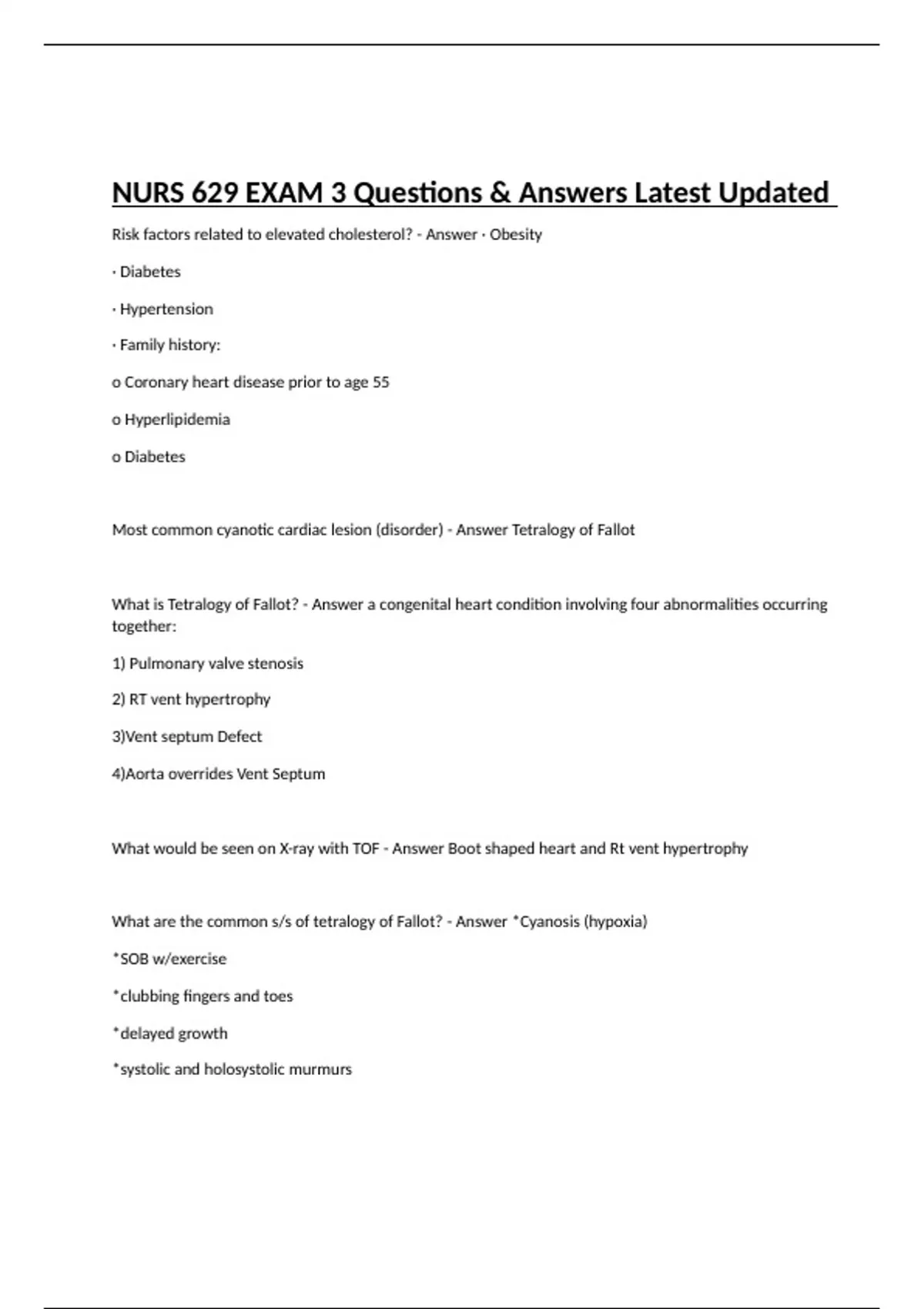 Risk factors related to elevated cholesterol? - Answer · Obesity · Diabetes · Hypertension · Family history: o Coronary heart disease prior to age 55 o Hyperlipidemia o Diabetes Most common cyanotic cardiac lesion (disorder) - Answer Tetralogy of Fallot What is Tetralogy of Fallot? - Answer a congenital heart condition involving four abnormalities occurring together: 1) Pulmonary valve stenosis 2) RT vent hypertrophy 3)Vent septum Defect 4)Aorta overrides Vent Septum What would be seen on X-ray with TOF - Answer Boot shaped heart and Rt vent hypertrophy What are the common s/s of tetralogy of Fallot? - Answer *Cyanosis (hypoxia) *SOB w/exercise *clubbing fingers and toes *delayed growth *systolic and holosystolic murmurs What criteria would you have to consider inpatient admission in a patient with pneumonia - Answer Comorbidities: lung dz, congenital Heart dz, DM, grunting child, O2 <92% What to expect of a 2-mo old visual acuity? - Answer *Vision of 20/400 *Can fix and follow objects S/S of viral conjunctivitis - Answer *Starts bilaterally *usually occurs with upper resp tract infection (adenovirus) *serous(watery) drainage *injected conjunctiva *Enlarged or tender preauricular nodes Clinical findings of of viral conjunctivitis - Answer *Normal visual acuity *injected conjunctiva *Preauricular lymphadenopathy Treatment of viral conjunctivitis - Answer * Symptomatic only * Warm or Cool compresses * Strict eye/hand hygiene * avoid contacts for a while What do you do for a patient with an elevated B/P on initial visit? - Answer *Repeat in 1-2 weeks and average over 3 visits *Pt to keep log for review *Encourage healthy lifestyle choices Asthma is disruptive several times during the night/interrupting sleep at least 3 times a week, what's the next step? - Answer Moderate persistant; prescribe inhaled steroid (flovent) Causative organism of bronchiolitis - Answer (RSV) Respiratory syncytial virus most likely cause what type of murmur is caused by normal blood flow thru normal cardiac structures in up to 80% children; Midsystolic; can come and go; Gets louder with fever, exercise, and anxiety - Answer functional or innocent murmur