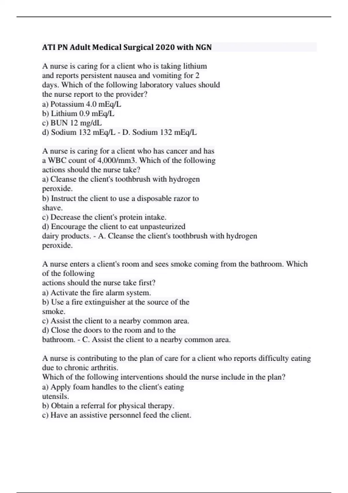 A nurse is caring for a client who is taking lithium and reports persistent nausea and vomiting for 2 days. Which of the following laboratory values should the nurse report to the provider? a) Potassium 4.0 mEq/L b) Lithium 0.9 mEq/L c) BUN 12 mg/dL d) Sodium 132 mEq/L - D. Sodium 132 mEq/L A nurse is caring for a client who has cancer and has a WBC count of 4,000/mm3. Which of the following actions should the nurse take? a) Cleanse the client's toothbrush with hydrogen peroxide. b) Instruct the client to use a disposable razor to shave. c) Decrease the client's protein intake. d) Encourage the client to eat unpasteurized dairy products. - A. Cleanse the client's toothbrush with hydrogen peroxide. A nurse enters a client's room and sees smoke coming from the bathroom. Which of the following actions should the nurse take first? a) Activate the fire alarm system. b) Use a fire extinguisher at the source of the smoke. c) Assist the client to a nearby common area. d) Close the doors to the room and to the bathroom. - C. Assist the client to a nearby common area. A nurse is contributing to the plan of care for a client who reports difficulty eating due to chronic arthritis. Which of the following interventions should the nurse include in the plan? a) Apply foam handles to the client's eating utensils. b) Obtain a referral for physical therapy. c) Have an assistive personnel feed the client.d) Ask the provider for a prescription for a pureed diet. - A. Apply foam handles to the client's eating utensils. A nurse is obtaining a medication history from a client who is to start taking nitroglycerin for chest discomfort with activity. Which of the following medications should the nurse instruct the client to avoid taking within 24 hr of using nitroglycerin? a) Atorvastatin b) Metformin c) Sildenafil d) Omeprazole - C. Sildenafil A nurse is preparing to obtain a postprandial blood glucose level from a client who has diabetes mellitus. Which of the following actions should the nurse take? a) Apply the first drop of blood to the test strip. b) Clean the client's finger with hexachlorophene. c) Prick the central tip of the client's finger. d) Hold the client's finger in a dependent position. - D. Hold the client's finger in a dependent position. A nurse is reinforcing teaching with a client about breast self-examinations. Which of the following statements by the client indicates an understanding of the teaching? a) "It is common for one breast to be larger than the other." b) "It is common for the skin on my breasts to dimple." c) "I will perform breast exams the day my period begins." d) "I will perform breast exams every other month." - A. "It is common for one breast to be larger than the other."
