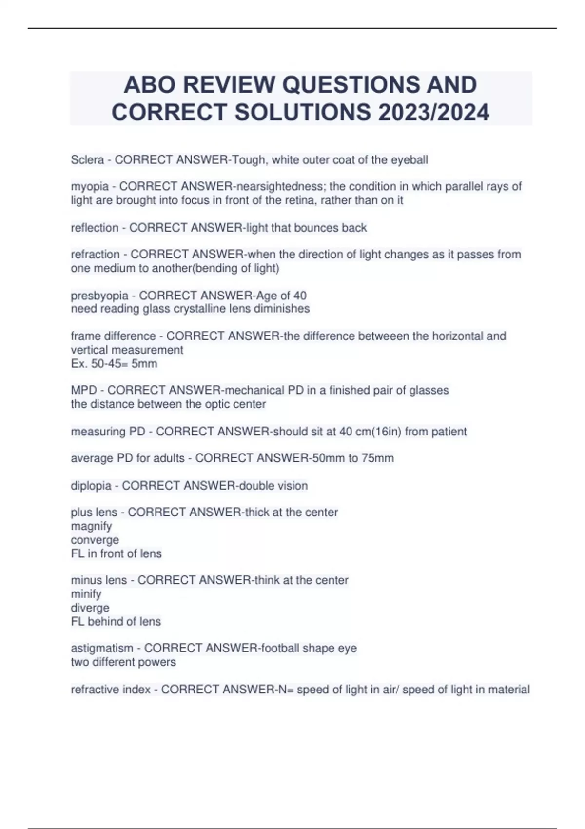 ABO REVIEW QUESTIONS AND CORRECT SOLUTIONS 2023/2024 Sclera - CORRECT ANSWER-Tough, white outer coat of the eyeball myopia - CORRECT ANSWER-nearsightedness; the condition in which parallel rays of light are brought into focus in front of the retina, rather than on it reflection - CORRECT ANSWER-light that bounces back refraction - CORRECT ANSWER-when the direction of light changes as it passes from one medium to another(bending of light) presbyopia - CORRECT ANSWER-Age of 40 need reading glass crystalline lens diminishes frame difference - CORRECT ANSWER-the difference betweeen the horizontal and vertical measurement Ex. 50-45= 5mm MPD - CORRECT ANSWER-mechanical PD in a finished pair of glasses the distance between the optic center measuring PD - CORRECT ANSWER-should sit at 40 cm(16in) from patient average PD for adults - CORRECT ANSWER-50mm to 75mm diplopia - CORRECT ANSWER-double vision plus lens - CORRECT ANSWER-thick at the center magnify converge FL in front of lens minus lens - CORRECT ANSWER-think at the center minify diverge FL behind of lens astigmatism - CORRECT ANSWER-football shape eye two different powers refractive index - CORRECT ANSWER-N= speed of light in air/ speed of light in material