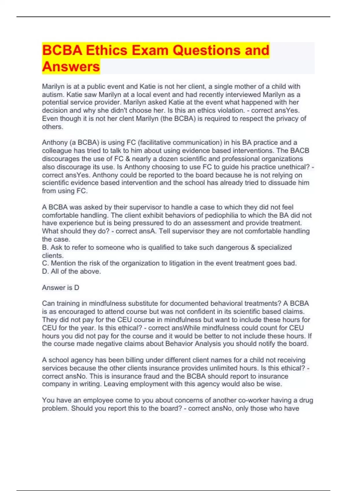 BCBA Ethics Exam Questions and Answers correctly solved 2023Marilyn is at a public event and Katie is not her client, a single mother of a child with autism. Katie saw Marilyn at a local event and had recently interviewed Marilyn as a potential service provider. Marilyn asked Katie at the event what happened with her decision and why she didn't choose her. Is this an ethics violation. - correct ansYes. Even though it is not her clent Marilyn (the BCBA) is required to respect the privacy of others. Anthony (a BCBA) is using FC (facilitative communication) in his BA practice and a colleague has tried to talk to him about using evidence based interventions. The BACB discourages the use of FC & nearly a dozen scientific and professional organizations also discourage its use. Is Anthony choosing to use FC to guide his practice unethical? - correct ansYes. Anthony could be reported to the board because he is not relying on scientific evidence based intervention and the school has already tried to dissuade him from using FC.