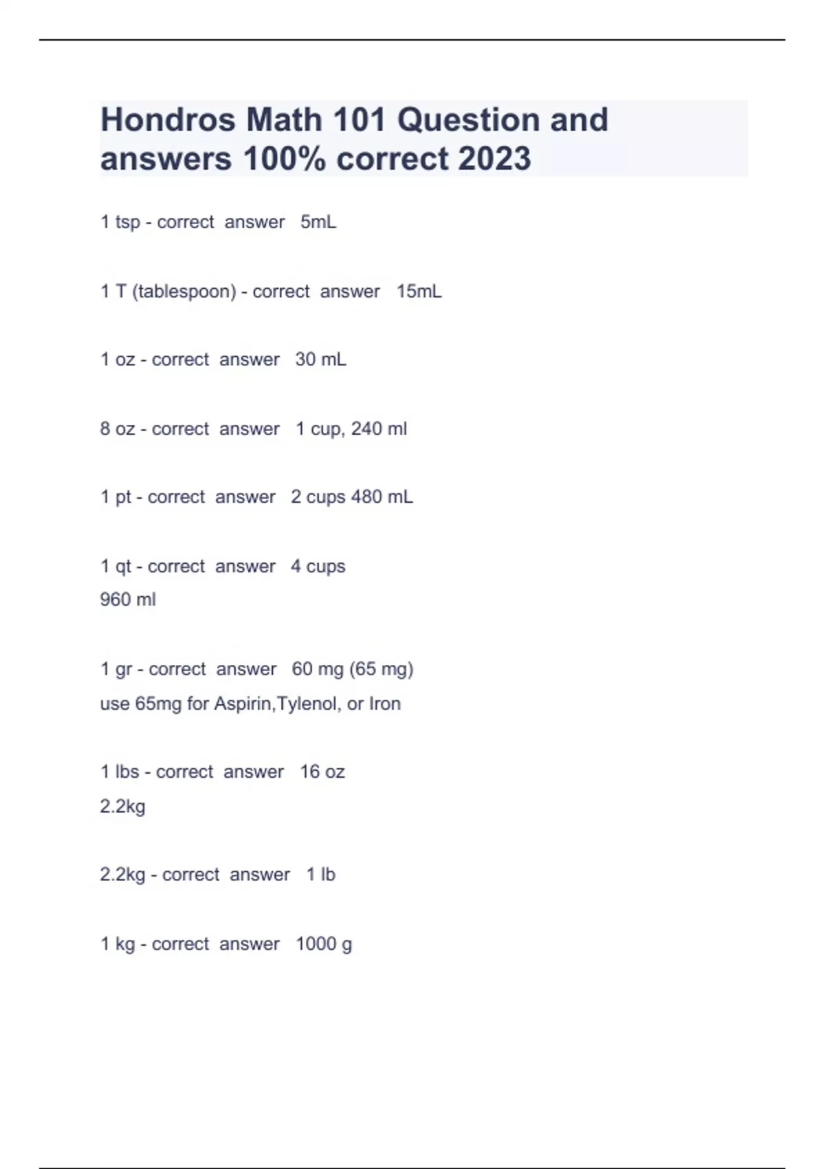Hondros Math 101 Question and answers 100% correct 20231 tsp - correct answer 5mL 1 T (tablespoon) - correct answer 15mL 1 oz - correct answer 30 mL 8 oz - correct answer 1 cup, 240 ml 1 pt - correct answer 2 cups 480 mL 1 qt - correct answer
