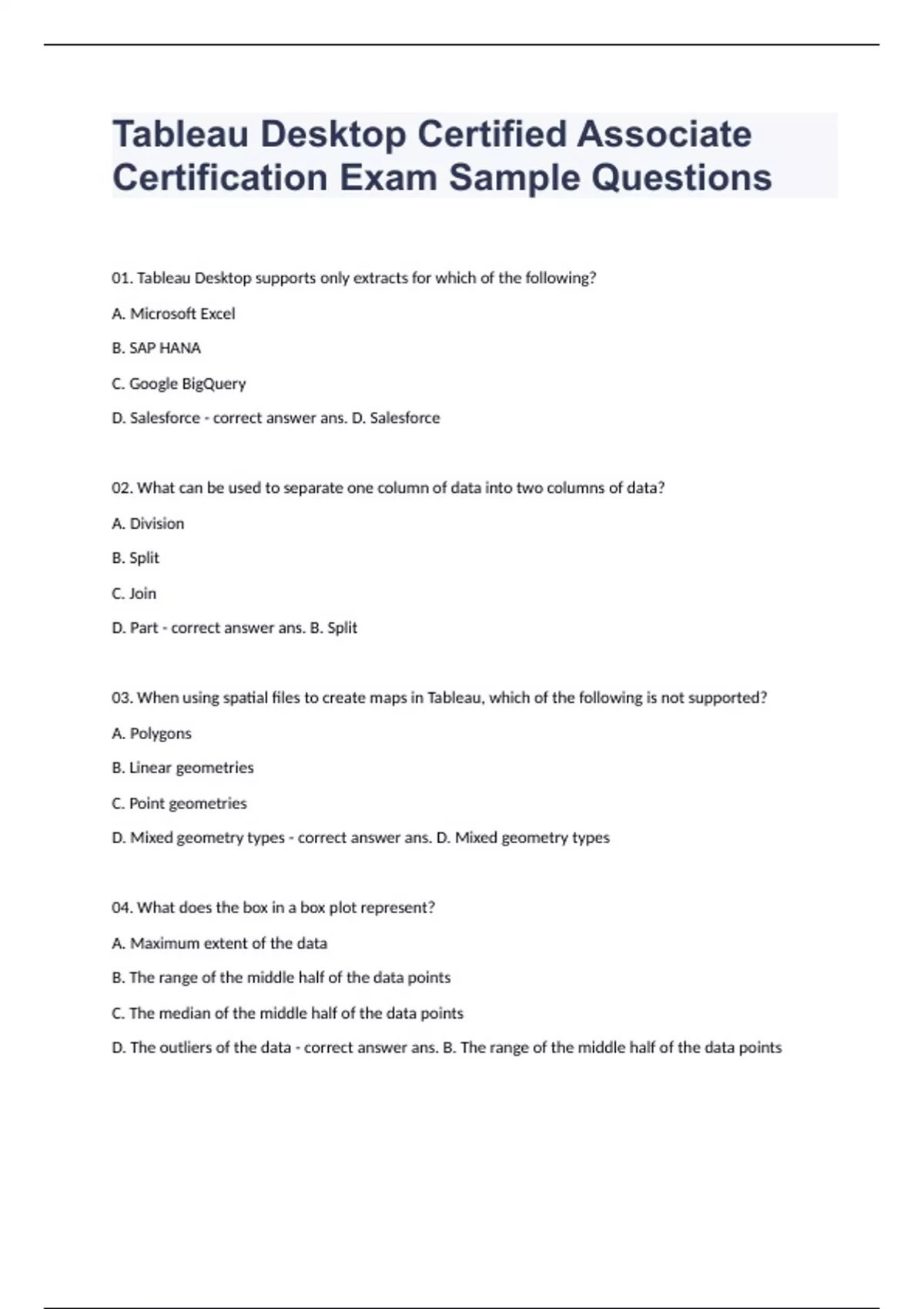 Tableau Desktop Certified Associate Certification Exam Sample Questions 01. Tableau Desktop supports only extracts for which of the following? A. Microsoft Excel B. SAP HANA C. Google BigQuery D. Salesforce - correct answer ans. D. Salesforce 02. What can be used to separate one column of data into two columns of data? A. Division B. Split C. Join D. Part - correct answer ans. B. Split 03. When using spatial files to create maps in Tableau, which of the following is not supported? A. Polygons B. Linear geometries C. Point geometries D. Mixed geometry types - correct answer ans. D. Mixed geometry types 04. What does the box in a box plot represent? A. Maximum extent of the data B. The range of the middle half of the data points C. The median of the middle half of the data points D. The outliers of the data - correct answer ans. B. The range of the middle half of the data points 05. To connect to multiple tables in a single data source at one time, what must be specified? A. A blend B. A calculation C. A join D. A hierarchy - correct answer ans. C. A join Desktop Associate Exam Guide to Boost Your Score in Tableau Desktop Certified Associate Certification Click Here... - correct answer How to Prepare for Desktop Associate exam on 2020.1? Click Here... - correct answer