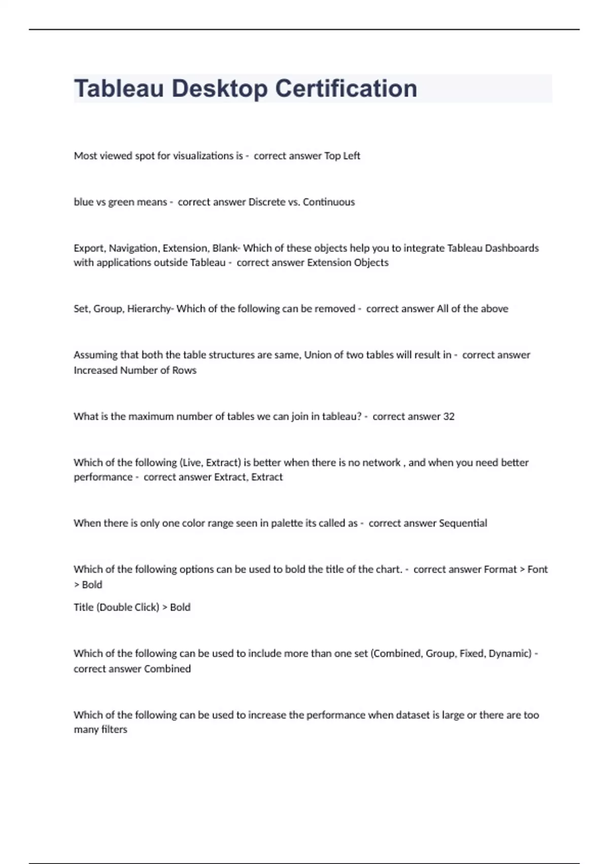 Tableau Desktop CertificationMost viewed spot for visualizations is - correct answer Top Left blue vs green means - correct answer Discrete vs. Continuous Export, Navigation, Extension, Blank- Which of these objects help you to integrate Tableau Dashboards with applications outside Tableau - correct answer Extension Objects Set, Group, Hierarchy- Which of the following can be removed - correct answer All of the above Assuming that both the table structures are same, Union of two tables will result in - correct answer Increased Number of Rows What is the maximum number of tables we can join in tableau? - correct answer 32 Which of the following (Live, Extract) is better when there is no network , and when you need better performance - correct answer Extract, Extract When there is only one color range seen in palette its called as - correct answer Sequential Which of the following options can be used to bold the title of the chart. - correct answer Format Font Bold Title (Double Click) Bold Which of the following can be used to include more than one set (Combined, Group, Fixed, Dynamic) - correct answer Combined Which of the following can be used to increase the performance when dataset is large or there are too many filters (Measure, Context, Extract, Dimension) - correct answer Context Which of the following is not a geographic role (Airport, Street/Lane, City, Area Code) - correct answer Street/Lane Size of the marks is not significant in which of chart type - correct answer Area Chart Text is not treated as Null when Mapped datatype is - correct answer Text Maps can float in floating Layout (T/F) - correct answer True Floating layout resizes based on dashboard size (T/F) - correct answer False Which of the following options can be used to change the palette color for dimensions (Assign Color, Change Palette, Assign Palette, Change Color) - correct answer Assign Palette The order in which the following filters are executed: Dimension, Context, Extract - correct answer Extract Context Dimension Which of the following (Group, Date, Hierarchy, Set) is used for data drill down - correct answer Hierarchy Layout Container Types For Dashboards - correct answer Horizontal, Vertical URL Prefixes Allowed in Dashboard Actions - correct answer FTP, HTTP, HTTPS Which of the file type does not contain the actual data but rather the information necessary to connect to the actual data - correct answer .tds files Which of the following options are used to italicize the content in tooltip.