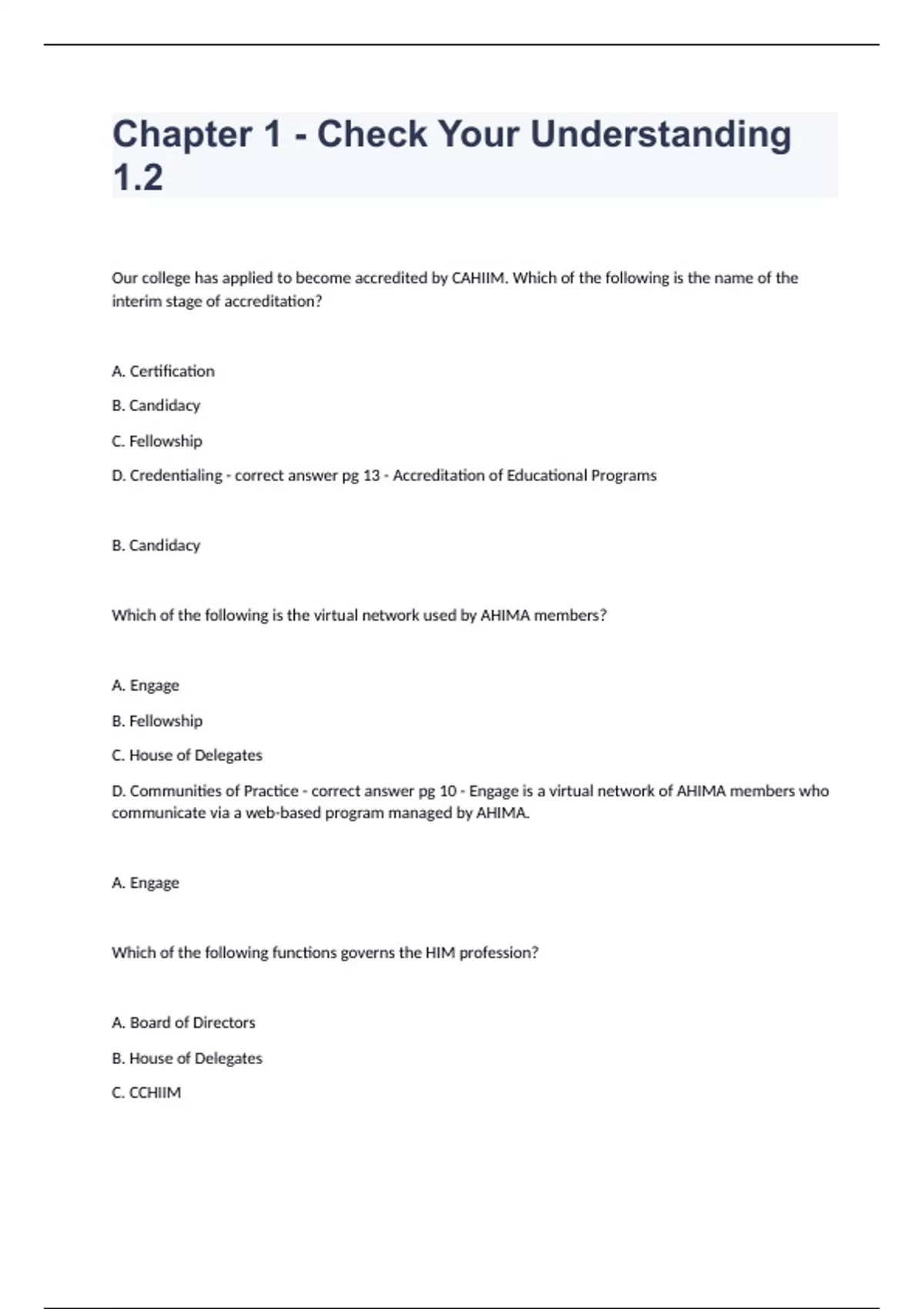 Chapter 1 - Check Your Understanding 1.2Our college has applied to become accredited by CAHIIM. Which of the following is the name of the interim stage of accreditation? A. Certification B. Candidacy C. Fellowship D. Credentialing - correct answer pg 13 - Accreditation of Educational Programs B. Candidacy Which of the following is the virtual network used by AHIMA members? A. Engage B. Fellowship C. House of Delegates D. Communities of Practice - correct answer pg 10 - Engage is a virtual network of AHIMA members who communicate via a web-based program managed by AHIMA. A. Engage Which of the following functions governs the HIM profession? A. Board of Directors B. House of Delegates C. CCHIIM D. CAHIIM - correct answer pg 12 - The House of Delegates is an extremely important component of the volunteer structure because it governs the profession (AHIMA 2014) B. House of Delegates The primary focus of AHIMA is to: A. Ensure that health records are complete B. Implement an electronic record in hospitals C. Foster professional development of its members D. Set and implement standards - correct answer pg 9 - AHIMA strives to foster the professional development of its members through education, certification, lifelong learning, and to advocate for the HIM profession. C. Foster professional development of its members. Which of the following certifications is administered by CCHIIM? A. Registered Health care Documentation Specialist B. Registered Health Information Technician C. Certified Professional in Healthcare Information and Management Systems D. Certified Professional Coder - correct answer pg 14 - Certification and Registration Program B. Registered Health Information Technician (RHIT)