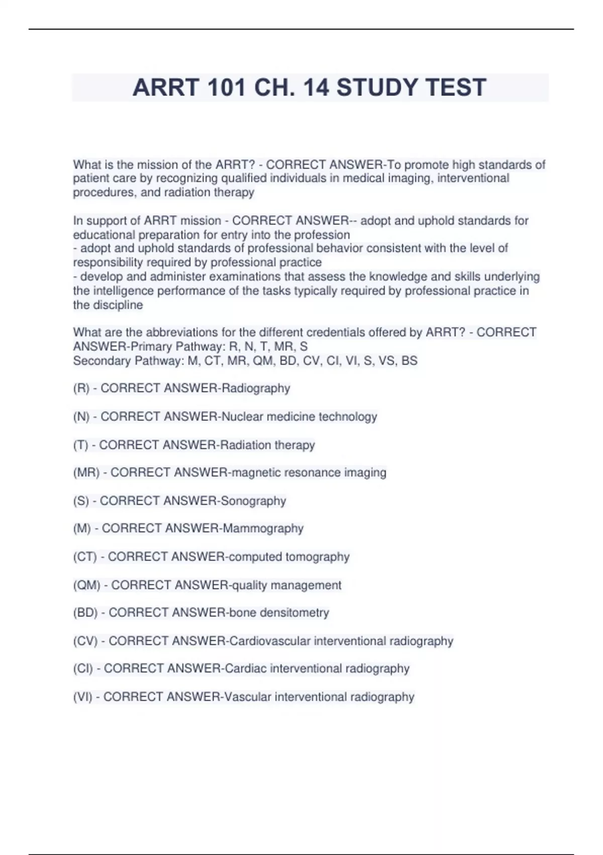 ARRT exam passing score -CORRECT ANSWER-Total scaled score of 75 or above; 3. All credits must be identified as category A or category A+, received approval before -reinforce the professional code of ethics for all practicing professionals -demonstrate accountability to peers, physicians, health care facilities and the public the activity attendance by a recognized continuing education evaluation mechanism. 4. Credits must be educational activities relevant to the radiologic sciences or patient meaningful than raw scores because they take into account the difficulty of a particular Purpose of CE requirements -CORRECT ANSWER--bridge gap between entry level Remember the following when renewing certification and taking CE: -CORRECT -continuing education required: bi-annually must obtain 24 CE credits -assure the public, our primary customers, that all technologists maintain competence home study courses, or internet activities may only be used once & never repeated. successfully; will be mailed pocket credentials andcertificate of registration field regardless of what examination form was administered. Does not include # of ?'s -annual renewal of certification required other requirements satisfied. answered correctly. 5. The same CE activity may not be used more than once in a biennium. Readings, money spent is used by society to move profession forward Certification -CORRECT ANSWER--named a RT (R)(ARRT) after exam is passed test to other forms of the same test. Represents the same level of test performance of course related to radiologic sciences or patient care from an accredited college or university Scaled score -CORRECT ANSWER-ARRT used to report examination result; more participation for CE activity is solely the technologist's responsibility -seminars: multiple credits can be obtained quickly reported on a scale that ranges from 1-99; does not constitute certification unless all Meeting the CE requirements -CORRECT ANSWER--costs $: knowledge gained, care -provide advanced growth opportunities for technologists through advanced preparation ANSWER-1. Attending, obtaining, and maintaining documentation of attendance and -prevent professional obsolescence -advance the profession through continuous growth of all technologists working in the 2. 24 credits are required during each 24 month biennium -academic courses: advanced degrees in different discipline or successful completion formal education and advanced practice needs -in-service education can be used -webinars, directed readings -lack immediacy and networking