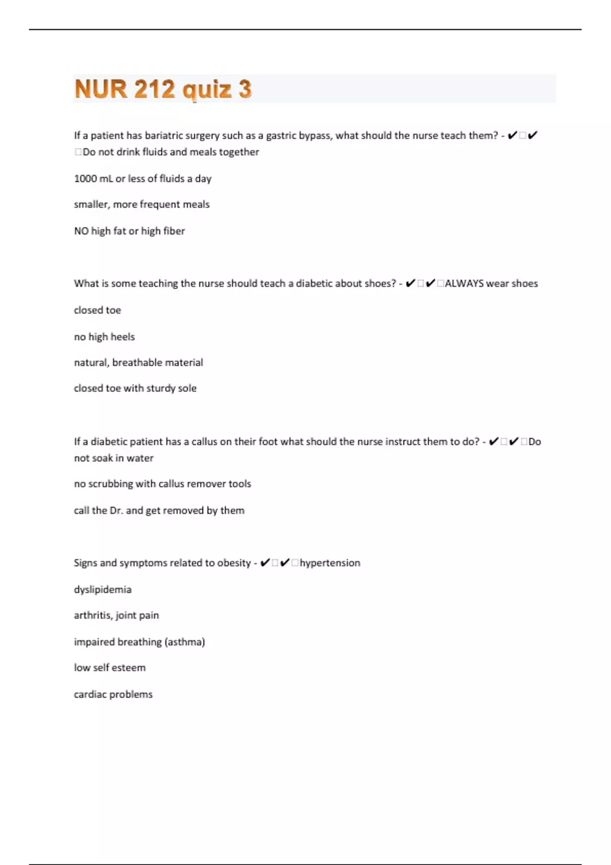If a patient has bariatric surgery such as a gastric bypass, what should the nurse teach them? - ️️Do not drink fluids and meals together 1000 mL or less of fluids a day smaller, more frequent meals NO high fat or high fiber What is some teaching the nurse should teach a diabetic about shoes? - ️️ALWAYS wear shoes closed toe no high heels natural, breathable material closed toe with sturdy sole If a diabetic patient has a callus on their foot what should the nurse instruct them to do? - ️️Do not soak in water no scrubbing with callus remover tools call the Dr. and get removed by them Signs and symptoms related to obesity - ️️hypertension dyslipidemia arthritis, joint pain impaired breathing (asthma) low self esteem cardiac problems regular insulin peak - ️️2-4 hours