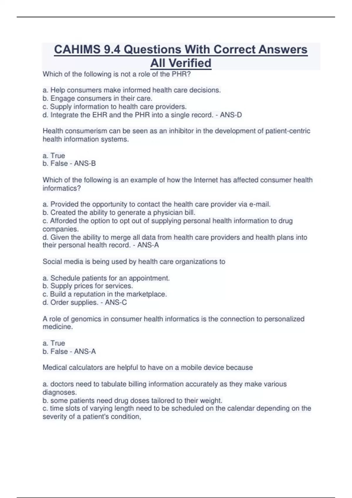 CAHIMS 9.4 Questions With Correct Answers All Verified Which of the following is not a role of the PHR? a. Help consumers make informed health care decisions. b. Engage consumers in their care. c. Supply information to health care providers. d. Integrate the EHR and the PHR into a single record. - ANS-D Health consumerism can be seen as an inhibitor in the development of patient-centric health information systems. a. True b. False - ANS-B Which of the following is an example of how the Internet has affected consumer health informatics? a. Provided the opportunity to contact the health care provider via e-mail. b. Created the ability to generate a physician bill. c. Afforded the option to opt out of supplying personal health information to drug companies. d. Given the ability to merge all data from health care providers and health plans into their personal health record. - ANS-A Social media is being used by health care organizations to a. Schedule patients for an appointment. b. Supply prices for services. c. Build a reputation in the marketplace. d. Order supplies. - ANS-C A role of genomics in consumer health informatics is the connection to personalized medicine. a. True b. False - ANS-A Medical calculators are helpful to have on a mobile device because a. doctors need to tabulate billing information accurately as they make various diagnoses. b. some patients need drug doses tailored to their weight. c. time slots of varying length need to be scheduled on the calendar depending on the severity of a patient's condition, Continues...