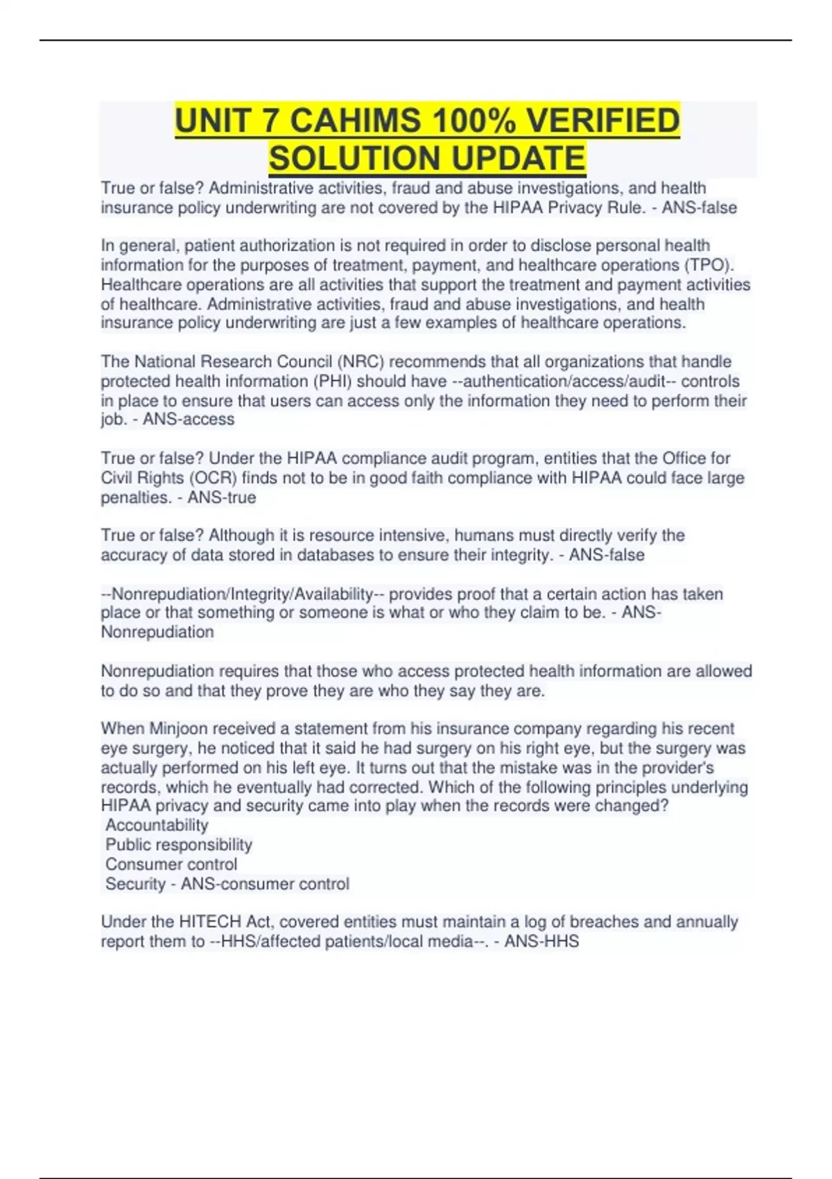 UNIT 7 CAHIMS 100% VERIFIED SOLUTION UPDATE True or false? Administrative activities, fraud and abuse investigations, and health insurance policy underwriting are not covered by the HIPAA Privacy Rule. - ANS-false In general, patient authorization is not required in order to disclose personal health information for the purposes of treatment, payment, and healthcare operations (TPO). Healthcare operations are all activities that support the treatment and payment activities of healthcare. Administrative activities, fraud and abuse investigations, and health insurance policy underwriting are just a few examples of healthcare operations. The National Research Council (NRC) recommends that all organizations that handle protected health information (PHI) should have --authentication/access/audit-- controls in place to ensure that users can access only the information they need to perform their job. - ANS-access True or false? Under the HIPAA compliance audit program, entities that the Office for Civil Rights (OCR) finds not to be in good faith compliance with HIPAA could face large penalties. - ANS-true True or false? Although it is resource intensive, humans must directly verify the accuracy of data stored in databases to ensure their integrity. - ANS-false --Nonrepudiation/Integrity/Availability-- provides proof that a certain action has taken place or that something or someone is what or who they claim to be. - ANSNonrepudiation Nonrepudiation requires that those who access protected health information are allowed to do so and that they prove they are who they say they are. When Minjoon received a statement from his insurance company regarding his recent eye surgery, he noticed that it said he had surgery on his right eye, but the surgery was actually performed on his left eye. It turns out that the mistake was in the provider's records, which he eventually had corrected. Which of the following principles underlying HIPAA privacy and security came into play when the records were changed? Accountability Public responsibility Consumer control Security - ANS-consumer control Under the HITECH Act, covered entities must maintain a log of breaches and annually report them to --HHS/affected patients/local media--. - ANS-HHS Providing patients with a copy of their paper health record poses a security safeguard challenge because the data must be encrypted. - ANS-false Data encryption is a security safeguard for electronic data, not paper data. An example of a public health agency that functions primarily as a -- covered/hybrid/noncovered-- entity is one that is mandated by state law to receive protected health information (PHI) from healthcare providers in order to conduct an epidemiological investigation. - ANS-noncovered In cases of --international disease outbreaks/births and deaths/workplace medical surveillance--, public health agencies must notify patients of disclosure of their protected health information (PHI) even though patient authorization is not required. - ANSworkplace medical surveillance Acme Health Informatics is a company that receives medical claim information from providers who do not have systems that can process standard code sets electronically. Acme converts this information into standard electronic format and submits it to the appropriate health insurance plan for processing. True or false? Acme Health Informatics is not a covered entity according to HIPAA. - ANS-false Acme Health Informatics is a healthcare clearinghouse and so is a covered entity according to HIPAA. True or false? The Privacy Act of 1974 applied only to federal agencies, not to state or local governments. - ANS-true Sonja is a data entry clerk for American Health Insurance Corporation. Her sole job function is to type information from paper claims into the company's computer system so it can be processed. She cannot view records of customer service calls or previously submitted claims. Which recommendation of the National Research Council (NRC) is the company following? Software discipline Backup plans Audit trails Access controls - ANS-access controls General Hospital has an automated process in place that records all accesses to its computer systems. Designated staff are charged with running reports to break down and review these accesses to ensure that any access to and creation or modification of protected health information (PHI) complies with regulations and hospital guidelines. Which of the following safeguards is the hospital implementing in maintaining this record of all accesses to its PHI?...