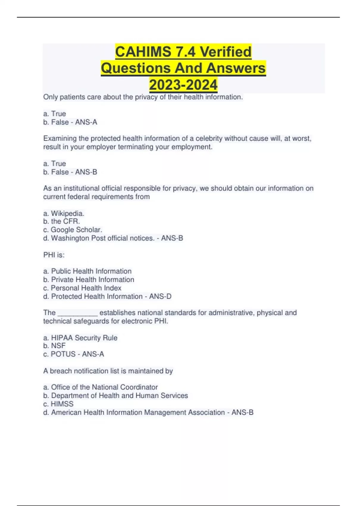 CAHIMS 7.4 Verified Questions And Answers Only patients care about the privacy of their health information. a. True b. False - ANS-A Examining the protected health information of a celebrity without cause will, at worst, result in your employer terminating your employment. a. True b. False - ANS-B As an institutional official responsible for privacy, we should obtain our information on current federal requirements from a. Wikipedia. b. the CFR. c. Google Scholar. d. Washington Post official notices. - ANS-B PHI is: a. Public Health Information b. Private Health Information c. Personal Health Index d. Protected Health Information - ANS-D The __________ establishes national standards for administrative, physical and technical safeguards for electronic PHI. a. HIPAA Security Rule b. NSF c. POTUS - ANS-A A breach notification list is maintained by a. Office of the National Coordinator b. Department of Health and Human Services c. HIMSS d. American Health Information Management Association - ANS-B Continues...