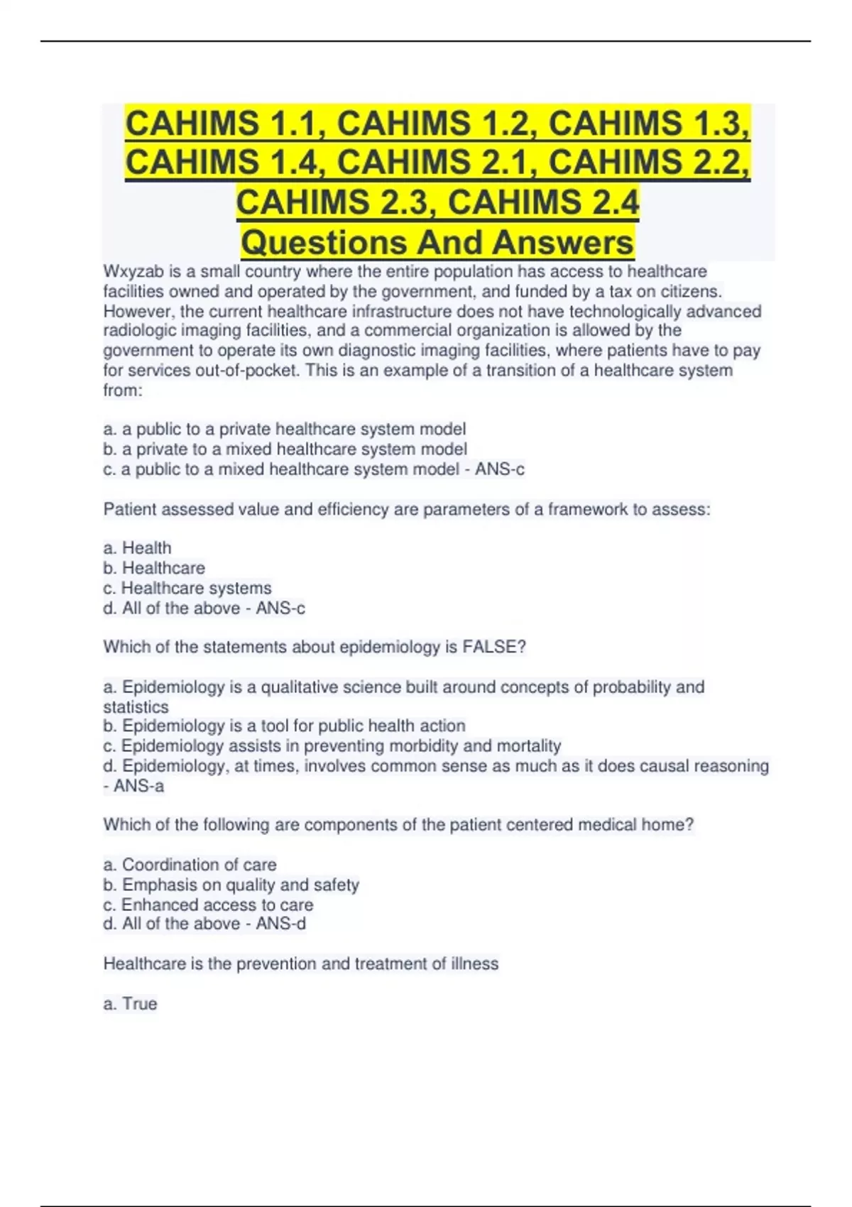 CAHIMS 1.1, CAHIMS 1.2, CAHIMS 1.3, CAHIMS 1.4, CAHIMS 2.1, CAHIMS 2.2, CAHIMS 2.3, CAHIMS 2.4 Questions And Answers Wxyzab is a small country where the entire population has access to healthcare facilities owned and operated by the government, and funded by a tax on citizens. However, the current healthcare infrastructure does not have technologically advanced radiologic imaging facilities, and a commercial organization is allowed by the government to operate its own diagnostic imaging facilities, where patients have to pay for services out-of-pocket. This is an example of a transition of a healthcare system from: a. a public to a private healthcare system model b. a private to a mixed healthcare system model c. a public to a mixed healthcare system model - ANS-c Patient assessed value and efficiency are parameters of a framework to assess: a. Health b. Healthcare c. Healthcare systems d. All of the above - ANS-c Which of the statements about epidemiology is FALSE? a. Epidemiology is a qualitative science built around concepts of probability and statistics b. Epidemiology is a tool for public health action c. Epidemiology assists in preventing morbidity and mortality d. Epidemiology, at times, involves common sense as much as it does causal reasoning - ANS-a Which of the following are components of the patient centered medical home? a. Coordination of care b. Emphasis on quality and safety c. Enhanced access to care d. All of the above - ANS-d Healthcare is the prevention and treatment of illness a. True b. False - ANS-a About 75 percent of healthcare establishments are hospitals a. True b. False - ANS-b An interdisciplinary team is a group of individuals with diverse training and backgrounds who work independently to improve patient care. a. True b. False - ANS-b Primary Care Organizations typically refer patients to what other types of organizations. a. Secondary Care b. Tertiary Care c. Secondary and Tertiary Care d. Neither Secondary or Tertiary Care - ANS-c Secondary Care Organizations are also known as Specialty Organizations. a. True b. False - ANS-a Federally Qualified Health Centers include the following: a. County Health Clinics b. Migrant Health Centers c. Look Alikes d. Tribal Operated Health Clinics - ANS-b Inpatient Care is usually defined as admission for medical care longer than: a. 8 hours b. 12 hours c. 24 hours d. 48 hours - ANS-c The type of Long Term Care organization that typically provides an apartment or room and includes personal care, meals and housekeeping is: a. Independent Living b. Assisted Living c. Skilled Nursing Facility d. Hospice - ANS-b The type of Long Term Call organization that provides services to people living with and dying from an eventually fatal condition is: a. Independent Living b. Assisted Living c. Skilled Nursing Facility d. Hospice - ANS-d The largest Integrated Healthcare System in the US is: a. Kaiser Permanente b. Veterans Health Administration c. TRICARE d. Indian Health Services - ANS-b Which of the following department would usually be a part of the Information division? a. Nursing Education b. Social Services c. Medical Records d. Security - ANS-c Observational data like the history, results of the physical exam and a summary of a surgery or procedure is recording using what type of data. a. Narrative b. Recorded Signals c. Numerical Measurements d. Images - ANS-a What two divisions may be combined to form a single Diagnostic and Therapeutic division? a. Nursing and Clinical Support b. Nursing and Ancillary Services c. Clinical Support and Medical Staff d. Clinical Support and Ancillary Services - ANS-d What type of communication can allow data to easily be viewed throughout the institution? a. Digital b. Film c. Verbal d. Paper - ANS-a The major difference between an academic and community hospital is the type of care they provide. a. True b. False - ANS-b Most people in the US get health insurance through: a. An employer b. Their county health department c. Their state health department d. The federal government - ANS-a All of the following are privately funded EXCEPT: a. BlueCross Blue Shield b. Commercial insurers c. Managed care organizations d. The Children's Health Insurance Program - ANS-d BlueCross BlueShield is: a. A managed care organization b. An association of private companies c. Funded by the federal government d. Funded by all 50 states - ANS-b Managed care plans: a. Are much less common today than they were 50 years ago b. Combine health insurance and healthcare services c. Pay doctors on a fee-for-service basis d. All of the above - ANS-b Of the following types of plans, costs for the patient are lowest, but choice of providers is most restricted, in a: a. Health maintenance organization b. Indemnity plan c. Preferred provider organization d. Point-of-service plan - ANS-a What group determines whether someone is eligible for Medicare and processes their premium payments? a. The Centers for Medicare & Medicaid Services b. The Federal Insurance Contributions Agency c. The Social Security Administration d. The US Department of Health & Human Services - ANS-c Choose the best statement about Medicaid and Medicare coverage: a. Medicaid covers older adults; Medicare covers people with low incomes. b. Medicaid covers people with low incomes; Medicare covers children and pregnant women in families that earn too much for Medicaid. c. Medicare covers older adults; Medicaid covers people with low incomes. d. Medicare covers all uninsured children and pregnant women; Medicaid covers older adults. - ANS-c Which of the following statements is/are TRUE? a. Medicaid has different names in different states. b. Medicaid is funded by federal income taxes; c. Medicare is partially funded by individuals and their employers through payroll taxes; d. Some people on Medicaid also qualify for Medicare. e. All of the above - ANS-e Samples of and electronic data interchange transaction include (choose all that apply): a. a fax copy of the