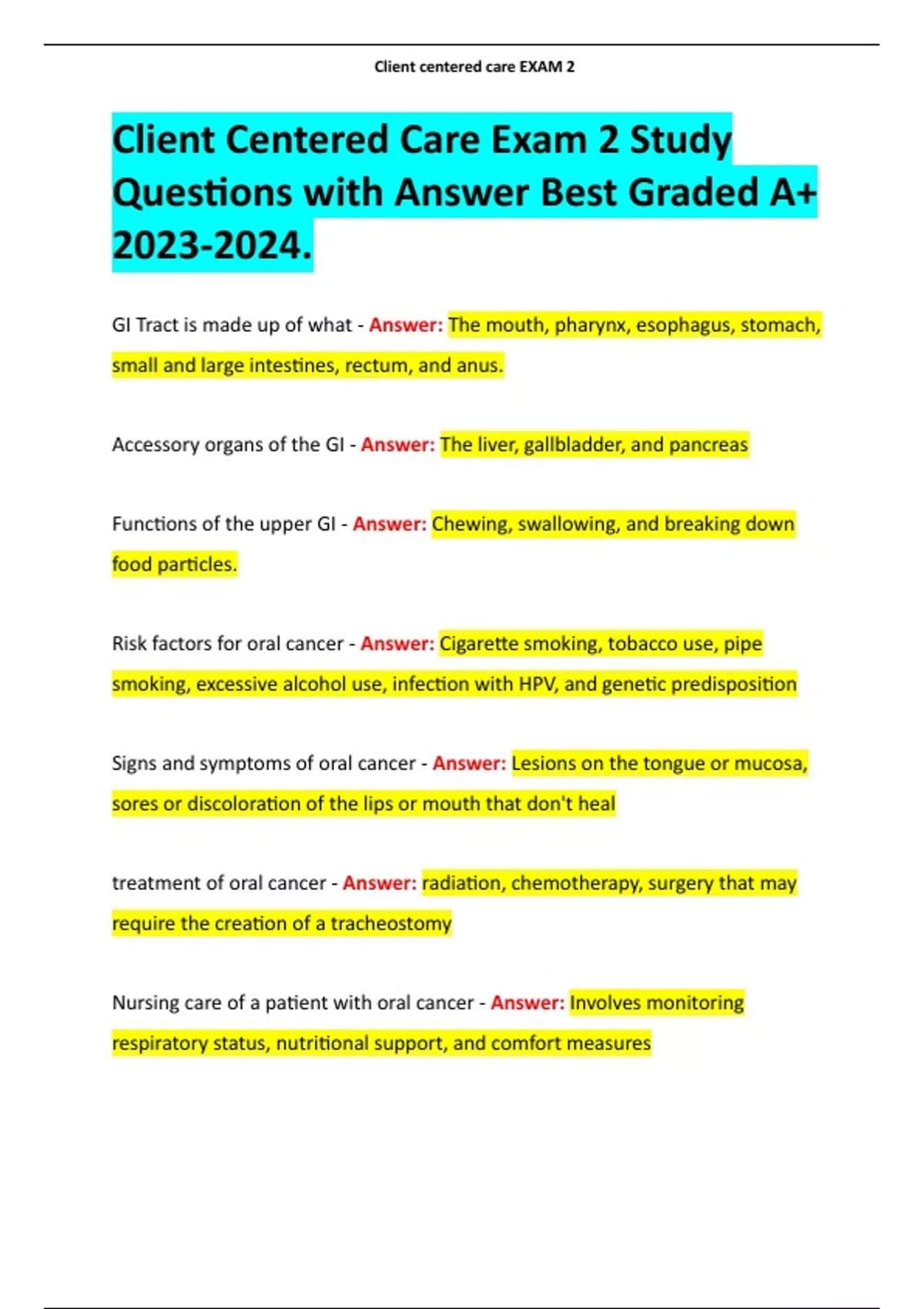 Client Centered Care Exam 2 Study Questions with Answer Best Graded A+ .