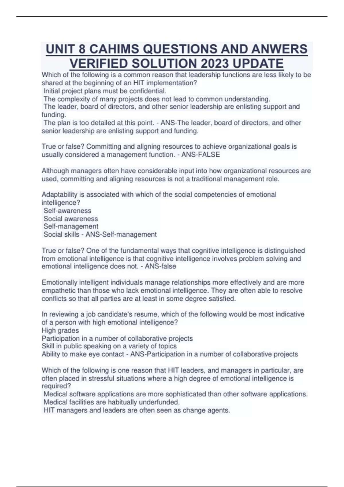 UNIT 8 CAHIMS QUESTIONS AND ANWERS VERIFIED SOLUTION 2023 UPDATE Which of the following is a common reason that leadership functions are less likely to be shared at the beginning of an HIT implementation? Initial project plans must be confidential. The complexity of many projects does not lead to common understanding. The leader, board of directors, and other senior leadership are enlisting support and funding. The plan is too detailed at this point. - ANS-The leader, board of directors, and other senior leadership are enlisting support and funding. True or false? Committing and aligning resources to achieve organizational goals is usually considered a management function. - ANS-FALSE Although managers often have considerable input into how organizational resources are used, committing and aligning resources is not a traditional management role. Adaptability is associated with which of the social competencies of emotional intelligence? Self-awareness Social awareness Self-management Social skills - ANS-Self-management True or false? One of the fundamental ways that cognitive intelligence is distinguished from emotional intelligence is that cognitive intelligence involves problem solving and emotional intelligence does not. - ANS-false Emotionally intelligent individuals manage relationships more effectively and are more empathetic than those who lack emotional intelligence. They are often able to resolve conflicts so that all parties are at least in some degree satisfied. In reviewing a job candidate's resume, which of the following would be most indicative of a person with high emotional intelligence? High grades Participation in a number of collaborative projects Skill in public speaking on a variety of topics Ability to make eye contact - ANS-Participation in a number of collaborative projects Which of the following is one reason that HIT leaders, and managers in particular, are often placed in stressful situations where a high degree of emotional intelligence is required? Medical software applications are more sophisticated than other software applications. Medical facilities are habitually underfunded. HIT managers and leaders are often seen as change agents. HIT leaders and managers have to cover multiple roles. - ANS-HIT managers and leaders are often seen as change agents. True or false? The CEO of a large medical hospital corporation with over 50,000 employees would be viewed primarily as an expert authority. - ANS-false Expert authority is earned through an individual's skills and abilities. What is an important first step in change management? Assess the scope of the change. Assign responsibility to key individuals. Promote the realization that change will take place. Assess the cost of the change. - ANS-Promote the realization that change will take place. True or false? Because of the technical nature of EHR systems, only clinicians should be nominated to roles involved in change management. - ANS-false When nominating people for roles in change management, all parts of the organization, clinical or not, should be represented. True or false? Critical considerations in change management are calculating and tracking the time, cost, and scope that the change will need. - ANS-false Critical considerations in project management, not change management, are calculating and tracking the time, cost and scope that the change will require. True or false? In a hybrid environment, it is not uncommon for a functional manager to collaborate with a vendor or consultant when upgrading or implementing an HIT system. - ANS-true True or false? Change management is a method for moderating or reducing opposition to change when implementing a technology, process, or organizational change. - ANStrue Monitoring and controlling are most often associated with which of the following? Change management Project management - ANS-project mgmt True or false? The only stakeholders in an EHR implementation for a medical center are the hospital staff. - ANS-false Stakeholders in an EHR implementation could include the hospital staff, the hospital administration, the hospital board, the patients, the software vendor, and the surrounding community and region. Using modern project management principles and methods would be in the checklist for which of the following phases of organizational change? Nominate roles Articulate goals Grow capabilities Entrench changes - ANS-nominate roles True or false? One result of replacing a paper-based system with an EHR system is that interaction among workers decreases. - ANS-true The technical part of change is managed by which of the following? Role assignment Change management System integration Project management - ANS-Project management Which of the following is a benefit of implementing change management? Select Yes or No for each option. Accelerates the speed at which individuals can successfully progress through the change process --YesNo Improves organizational results --YesNo Improves employee morale --YesNo Enhances the quality of service --YesNo - ANS-yes yes yes yes James Newby manages a team responsible for providing technical support for the resident EHR system. He is currently working in concert with a project manager and a vendor representative on extensive upgrades to the system. Which of the following best describes this working arrangement? Mixed project environment Crossover management matrix Functional Hybrid environment - ANS-hybrid environment Which of the following describes an HIT project manager operating in a functional organizational structure? Low responsibility, low authority High responsibility, high authority High responsibility, low authority Low responsibility, high authority - ANS-High responsibility, low authority True or false? One of the main advantages of a functional organization is its flexibility. - ANS-false True or false? Because of the short time cycles and many different time demands, it is not a good use of time for a temporary le