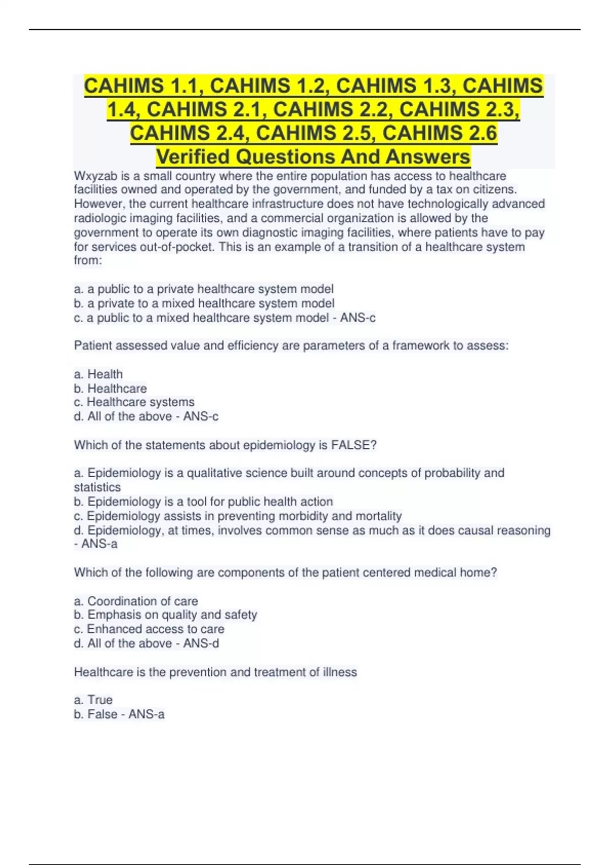 CAHIMS 1.1, CAHIMS 1.2, CAHIMS 1.3, CAHIMS 1.4, CAHIMS 2.1, CAHIMS 2.2, CAHIMS 2.3, CAHIMS 2.4, CAHIMS 2.5, CAHIMS 2.6 Verified Questions And Answers Wxyzab is a small country where the entire population has access to healthcare facilities owned and operated by the government, and funded by a tax on citizens. However, the current healthcare infrastructure does not have technologically advanced radiologic imaging facilities, and a commercial organization is allowed by the government to operate its own diagnostic imaging facilities, where patients have to pay for services out-of-pocket. This is an example of a transition of a healthcare system from: a. a public to a private healthcare system model b. a private to a mixed healthcare system model c. a public to a mixed healthcare system model - ANS-c Patient assessed value and efficiency are parameters of a framework to assess: a. Health b. Healthcare c. Healthcare systems d. All of the above - ANS-c Which of the statements about epidemiology is FALSE? a. Epidemiology is a qualitative science built around concepts of probability and statistics b. Epidemiology is a tool for public health action c. Epidemiology assists in preventing morbidity and mortality d. Epidemiology, at times, involves common sense as much as it does causal reasoning - ANS-a Which of the following are components of the patient centered medical home? a. Coordination of care b. Emphasis on quality and safety c. Enhanced access to care d. All of the above - ANS-d Healthcare is the prevention and treatment of illness a. True b. False - ANS-a About 75 percent of healthcare establishments are hospitals a. True b. False - ANS-b An interdisciplinary team is a group of individuals with diverse training and backgrounds who work independently to improve patient care. a. True b. False - ANS-b Primary Care Organizations typically refer patients to what other types of organizations. a. Secondary Care b. Tertiary Care c. Secondary and Tertiary Care d. Neither Secondary or Tertiary Care - ANS-c Secondary Care Organizations are also known as Specialty Organizations. a. True b. False - ANS-a Federally Qualified Health Centers include the following: a. County Health Clinics b. Migrant Health Centers c. Look Alikes d. Tribal Operated Health Clinics - ANS-b Inpatient Care is usually defined as admission for medical care longer than: a. 8 hours b. 12 hours c. 24 hours d. 48 hours - ANS-c The type of Long Term Care organization that typically provides an apartment or room and includes personal care, meals and housekeeping is: a. Independent Living b. Assisted Living c. Skilled Nursing Facility d. Hospice - ANS-b The type of Long Term Call organization that provides services to people living with and dying from an eventually fatal condition is: a. Independent Living b. Assisted Living c. Skilled Nursing Facility d. Hospice - ANS-d The largest Integrated Healthcare System in the US is: a. Kaiser Permanente b. Veterans Health Administration c. TRICARE d. Indian Health Services - ANS-b Which of the following department would usually be a part of the Information division? a. Nursing Education b. Social Services c. Medical Records d. Security - ANS-c Observational data like the history, results of the physical exam and a summary of a surgery or procedure is recording using what type of data. a. Narrative b. Recorded Signals c. Numerical Measurements d. Images - ANS-a What two divisions may be combined to form a single Diagnostic and Therapeutic division? a. Nursing and Clinical Support b. Nursing and Ancillary Services c. Clinical Support and Medical Staff d. Clinical Support and Ancillary Services - ANS-d What type of communication can allow data to easily be viewed throughout the institution? a. Digital b. Film c. Verbal d. Paper - ANS-a The major difference between an academic and community hospital is the type of care they provide. a. True b. False - ANS-b Most people in the US get health insurance through: a. An employer b. Their county health department c. Their state health department d. The federal government - ANS-a All of the following are privately funded EXCEPT: a. BlueCross Blue Shield b. Commercial insurers c. Managed care organizations d. The Children's Health Insurance Program - ANS-d BlueCross BlueShield is: a. A managed care organization b. An association of private companies c. Funded by the federal government d. Funded by all 50 states - ANS-b Managed care plans: a. Are much less common today than they were 50 years ago b. Combine health insurance and healthcare services c. Pay doctors on a fee-for-service basis d. All of the above - ANS-b Of the following types of plans, costs for the patient are lowest, but choice of providers is most restricted, in a: a. Health maintenance organization b. Indemnity plan c. Preferred provider organization d. Point-of-service plan - ANS-a What group determines whether someone is eligible for Medicare and processes their premium payments? a. The Centers for Medicare & Medicaid Services b. The Federal Insurance Contributions Agency c. The Social Security Administration d. The US Department of Health & Human Services - ANS-c Choose the best statement about Medicaid and Medicare coverage: a. Medicaid covers older adults; Medicare covers people with low incomes. b. Medicaid covers people with low incomes; Medicare covers children and pregnant women in families that earn too much for Medicaid. c. Medicare covers older adults; Medicaid covers people with low incomes. d. Medicare covers all uninsured children and pregnant women; Medicaid covers older adults. - ANS-c Which of the following statements is/are TRUE? a. Medicaid has different names in different states. b. Medicaid is funded by federal income taxes; c. Medicare is partially funded by individuals and their employers through payroll taxes; d. Some people on Medicaid also qualify for Medicare. e. All of the above - ANS-e Samples of and electronic data interchange transaction include (choose all 