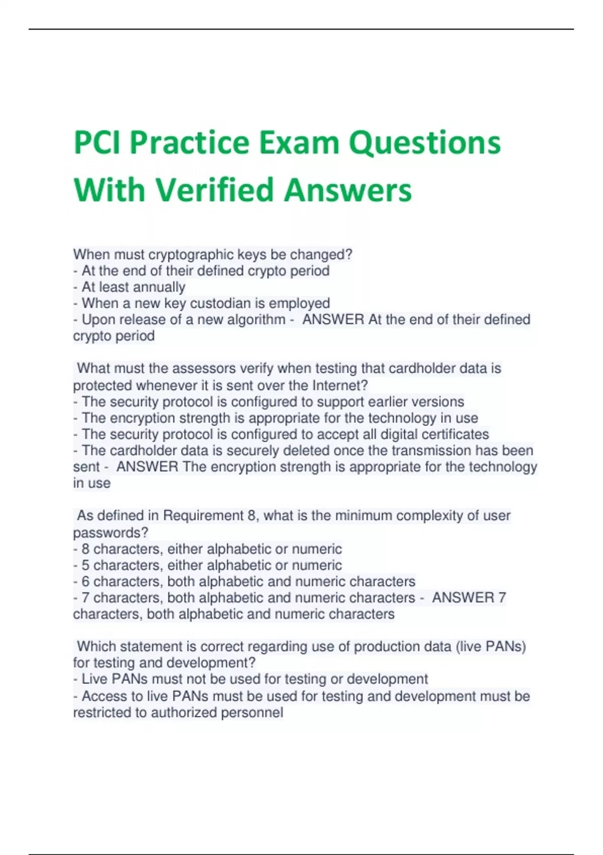 PCI Practice Exam Questions With Verified Answers When must cryptographic keys be changed? - At the end of their defined crypto period - At least annually - When a new key custodian is employed - Upon release of a new algorithm - ANSWER At the end of their defined crypto period What must the assessors verify when testing that cardholder data is protected whenever it is sent over the Internet? - The security protocol is configured to support earlier versions - The encryption strength is appropriate for the technology in use - The security protocol is configured to accept all digital certificates - The cardholder data is securely deleted once the transmission has been sent - ANSWER The encryption strength is appropriate for the technology in use As defined in Requirement 8, what is the minimum complexity of user passwords? - 8 characters, either alphabetic or numeric - 5 characters, either alphabetic or numeric - 6 characters, both alphabetic and numeric characters - 7 characters, both alphabetic and numeric characters - ANSWER 7 characters, both alphabetic and numeric characters Which statement is correct regarding use of production data (live PANs) for testing and development? - Live PANs must not be used for testing or development - Access to live PANs must be used for testing and development must be restricted to authorized personnel - Live PANs must be used for testing and development - All live PANs used for testing and development must be authorized by the cardholder - ANSWER Live PANs must not be used for testing or development Which of the following is an example of multi-factor authentication? - A token that must be presented twice during the login process - A user passphrase and an application-level password - A user password and a PIN-activated smart card - A user fingerprint and a user thumbprint - ANSWER A user password and a PIN-activated smart card Which of the following types of events is required to be logged? - All use of end-user messaging technologies - All access to external websites - All access to all audit trails - All network transmissions - ANSWER All access to all audit trails Which of the following meets PCI DSS requirements for secure destruction of media containing cardholder data? - Cardholder data on hard copy materials is copied to electronic media before the hard copy materials are destroyed - Storage containers used for hardcopy materials are located outside of the CDE - Electronic media is physically destroyed to ensure the data cannot be reconstructed - Electronic media is stored in a secure location when the data is no longer needed for business or legal reasons - ANSWER Electronic media is physically destroyed to ensure the data cannot be reconstructed