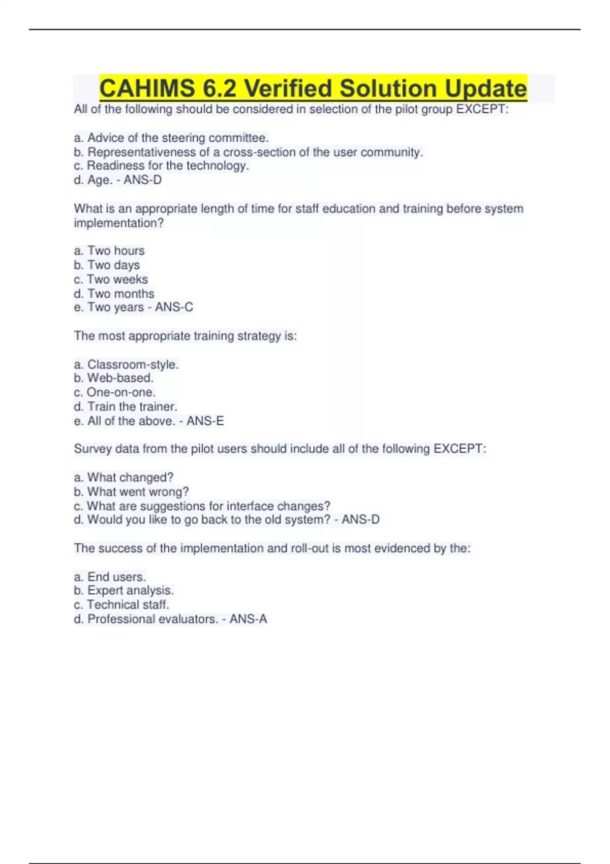 CAHIMS 6.2 Verified Solution Update All of the following should be considered in selection of the pilot group EXCEPT: a. Advice of the steering committee. b. Representativeness of a cross-section of the user community. c. Readiness for the technology. d. Age. - ANS-D What is an appropriate length of time for staff education and training before system implementation? a. Two hours b. Two days c. Two weeks d. Two months e. Two years - ANS-C The most appropriate training strategy is: a. Classroom-style. b. Web-based. c. One-on-one. d. Train the trainer. e. All of the above. - ANS-E Survey data from the pilot users should include all of the following EXCEPT: a. What changed? b. What went wrong? c. What are suggestions for interface changes? d. Would you like to go back to the old system? - ANS-D The success of the implementation and roll-out is most evidenced by the: Continues...