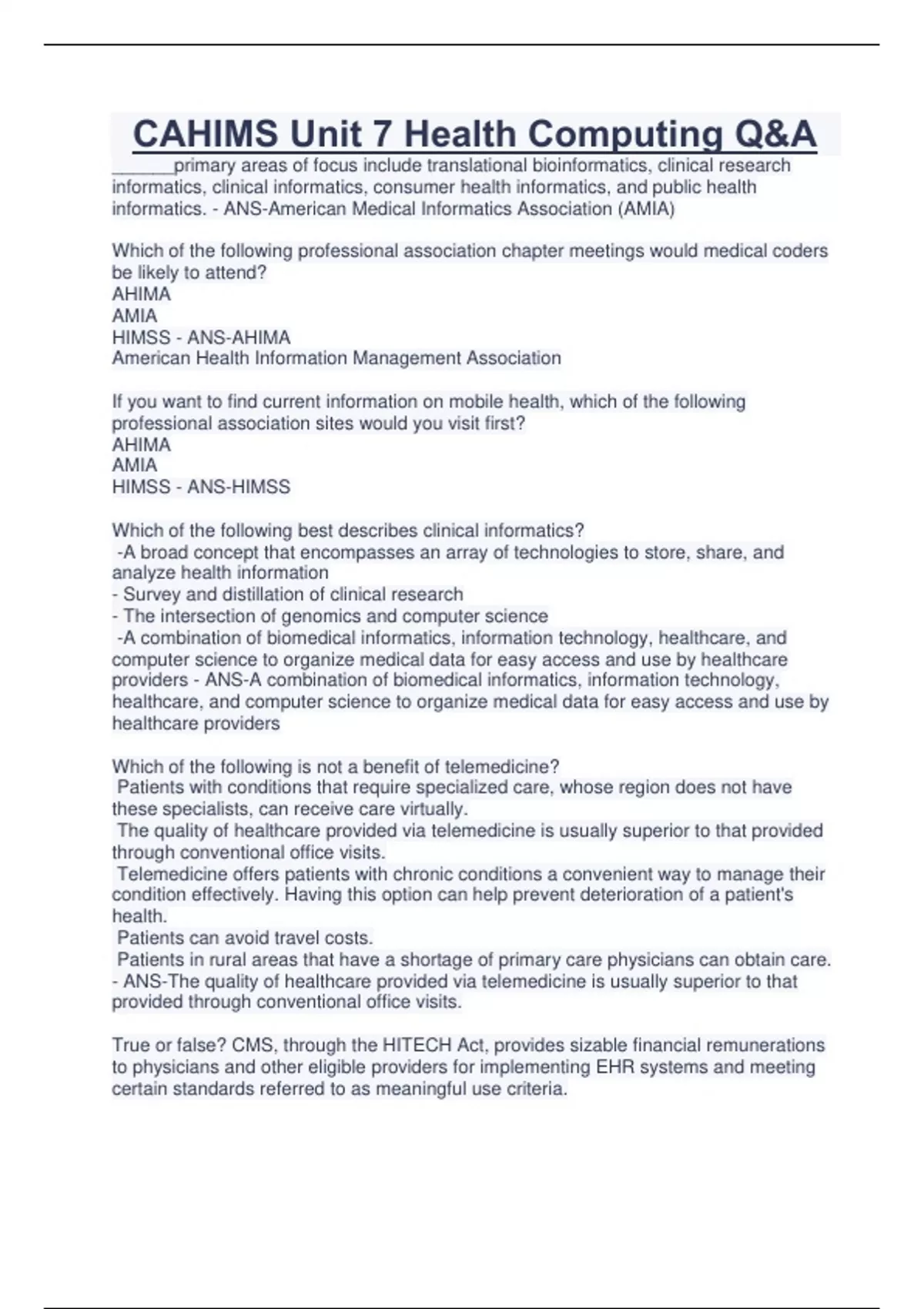 CAHIMS Unit 7 Health Computing Q&A ______primary areas of focus include translational bioinformatics, clinical research informatics, clinical informatics, consumer health informatics, and public health informatics. - ANS-American Medical Informatics Association (AMIA) Which of the following professional association chapter meetings would medical coders be likely to attend? AHIMA AMIA HIMSS - ANS-AHIMA American Health Information Management Association If you want to find current information on mobile health, which of the following professional association sites would you visit first? AHIMA AMIA HIMSS - ANS-HIMSS Which of the following best describes clinical informatics? -A broad concept that encompasses an array of technologies to store, share, and analyze health information - Survey and distillation of clinical research - The intersection of genomics and computer science -A combination of biomedical informatics, information technology, healthcare, and computer science to organize medical data for easy access and use by healthcare providers - ANS-A combination of biomedical informatics, information technology, healthcare, and computer science to organize medical data for easy access and use by healthcare providers Which of the following is not a benefit of telemedicine? Patients with conditions that require specialized care, whose region does not have these specialists, can receive care virtually. The quality of healthcare provided via telemedicine is usually superior to that provided through conventional office visits. Telemedicine offers patients with chronic conditions a convenient way to manage their condition effectively. Having this option can help prevent deterioration of a patient's health. Patients can avoid travel costs. Patients in rural areas that have a shortage of primary care physicians can obtain care. - ANS-The quality of healthcare provided via telemedicine is usually superior to that provided through conventional office visits. True or false? CMS, through the HITECH Act, provides sizable financial remunerations to physicians and other eligible providers for implementing EHR systems and meeting certain standards referred to as meaningful use criteria. True False - ANS-true Which of the following are ethical uses of health data accessed through HIT applications? A cancer research center shares anonymized data from its patients with another cancer research institute. A nurse on the phone, within earshot of patients in a waiting room, says, "Hi, Mrs. Jones. Your pregnancy test came back negative." An employee at a healthcare organization looks at the record of a patient he knows socially, even though he is not that patient's medical provider. A genetics testing company provides information about clients to an insurance company. - ANS-A cancer research center shares anonymized data from its patients with another cancer research institute. True or false? Third-party payers can influence EHR implementations by offering financial bonuses for improved performance, the documentation of which typically requires an EHR system. -Continues...