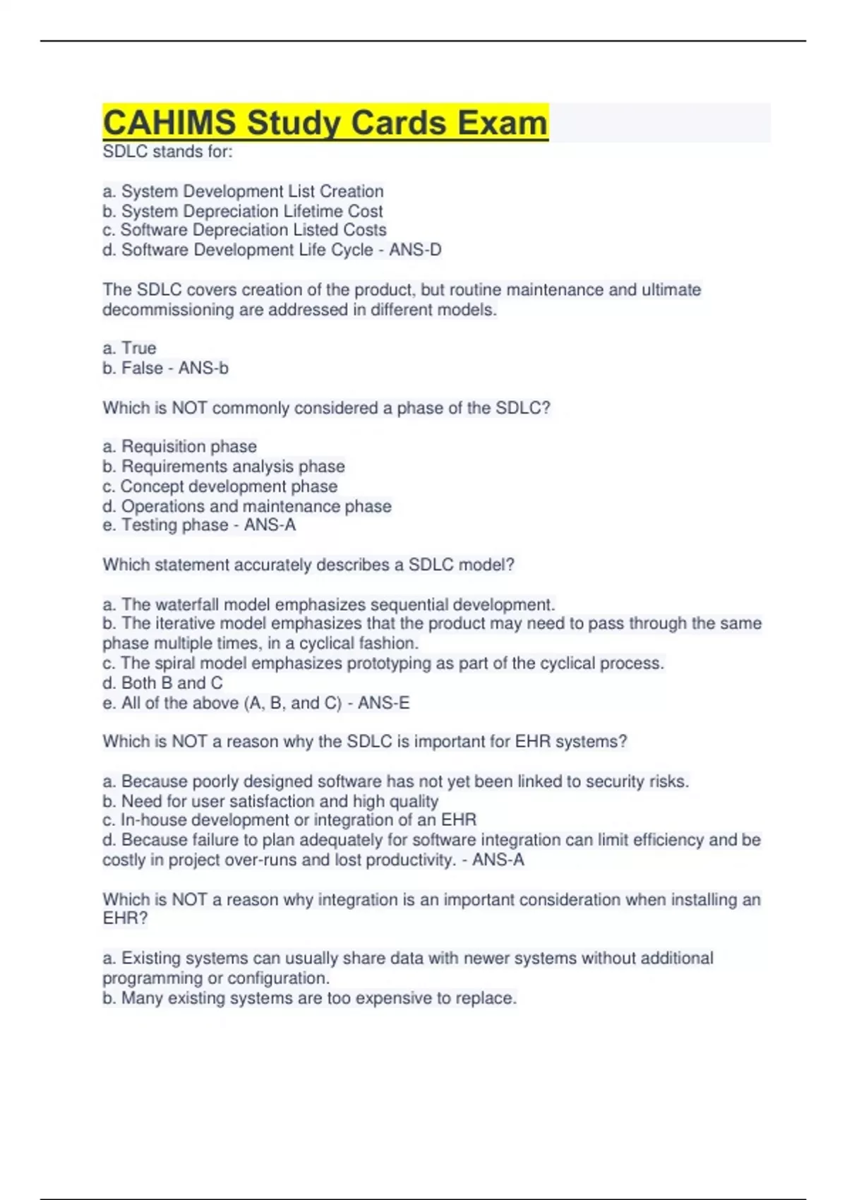 CAHIMS Study Cards Exam SDLC stands for: a. System Development List Creation b. System Depreciation Lifetime Cost c. Software Depreciation Listed Costs d. Software Development Life Cycle - ANS-D The SDLC covers creation of the product, but routine maintenance and ultimate decommissioning are addressed in different models. a. True b. False - ANS-b Which is NOT commonly considered a phase of the SDLC? a. Requisition phase b. Requirements analysis phase c. Concept development phase d. Operations and maintenance phase e. Testing phase - ANS-A Which statement accurately describes a SDLC model? a. The waterfall model emphasizes sequential development. b. The iterative model emphasizes that the product may need to pass through the same phase multiple times, in a cyclical fashion. c. The spiral model emphasizes prototyping as part of the cyclical process. d. Both B and C e. All of the above (A, B, and C) - ANS-E Which is NOT a reason why the SDLC is important for EHR systems? a. Because poorly designed software has not yet been linked to security risks. b. Need for user satisfaction and high quality c. In-house development or integration of an EHR d. Because failure to plan adequately for software integration can limit efficiency and be costly in project over-runs and lost productivity. - ANS-A Which is NOT a reason why integration is an important consideration when installing an EHR? a. Existing systems can usually share data with newer systems without additional programming or configuration. b. Many existing systems are too expensive to replace. c. Many different isolated systems currently exist within healthcare infrastructures. d. Many existing systems are tailored to meet specific departmental needs and not easily duplicated. - ANS-A Which definition is incorrect? a. An interface is a point of interaction between components. b. Point-to-point interfacing involves connecting systems end to end, as if in a chain, so that each connects to no more than two others. c. Integration is the process of connecting various subsystems into the larger system, ensuring that subsystems function together as a whole. d. An interface engine routes data through a centralized location. - ANS-B Which statement is true of the point-to-point interface method? a. It is a newer, less traditional method. b. Data is routed through a centralized location. c. Its direct linkages can provide secure transmission. d. Both b and c - ANS-C Which statement is true of an interface engine? a. More separate connectivity points than point-to-point b. More flexible and scalable than point-to-point c. Easier to install and maintain than point-to-point d. Both b and c - ANS-D Which statement is NOT true of an HIE? a. "HIE" stands for Health Improvement Enterprise. b. It maintains the meaning of healthcare information as it moves between disparate systems. c. It can be used for integration between EHRs. d. It can be set up privately or regionally. - ANS-A Which is NOT an advantage of integrating EHRs? a. Enables hospitals to share patient information. b. Enables providers to meet the HITECH "meaningful use" criteria. c. Enhances billing/payment and reform initiatives. d. Improves security and privacy of patient data. e. Streamlines workflows between hospitals and clinics. - ANS-D Which is NOT true of HL7? a. Creates communication standards for use only in American healthcare applications. b. Promotes open system architecture. c. Created a structured, message-oriented framework for communication between healthcare applications. d. Created a messaging standard that uses segment headers and delimiters to communicate information. - ANS-A Which of the following is an important structural characteristic of effective teams? a. individual contribution b. trust c. appropriate culture d. flexibility - ANS-C Effective implementation teams learn from mistakes. Which of the following is essential to support teams in learning from mistakes? a. safety committee b. risk management c. quality improvement d. culture of transparency - ANS-D Effective change and transition management are critical to effective implementation planning. Each of the following strategies ensures effective change and transition management EXCEPT: a. ensuring that professionals work side-by-side b. understanding and respecting team member roles c. communication d. recognizing that teamwork requires work - ANS-A There are a variety of strategies for effective implementation planning. Which of the following is a limitation of the single vendor strategy? a. It requires a wide range of skills to manage the applications. b. If it fails, the organization can incur significant losses. c. It is a fragmentation of work. d. A single contract makes it difficult to manage initial capital outlays and ongoing operating costs. - ANS-B To enhance implementation team effectiveness: a. regular meetings should be scheduled, but unstructured agendas are desirable since they allow for free-flowing conversation b. regular meetings are not required, just as long as the team gets its work done c. regular meetings should be scheduled and a standard agenda set d. meetings should only be conducted when the chair has something to communicate to the team - ANS-C One of the advantages of "best of breed" approaches over single vendor options is that: a. massive process reengineering is avoided b. contract management is streamlined c. software maintenance is easier d. competency development is facilitated - ANS-A Two approaches that have been used successfully for HIT implementations are the big bang and staggered, or incremental, approaches. Which of the following correctly depicts big bang implementation strategies? a. high risk, high anxiety b. high risk, low anxiety c. low risk, high anxiety d. low risk, low anxiety - ANS-A Which of the following is true of incremental implementation strategies? a. They have a quicker return on investment. b. They are high risk, high anxiety. c. They require greater numb