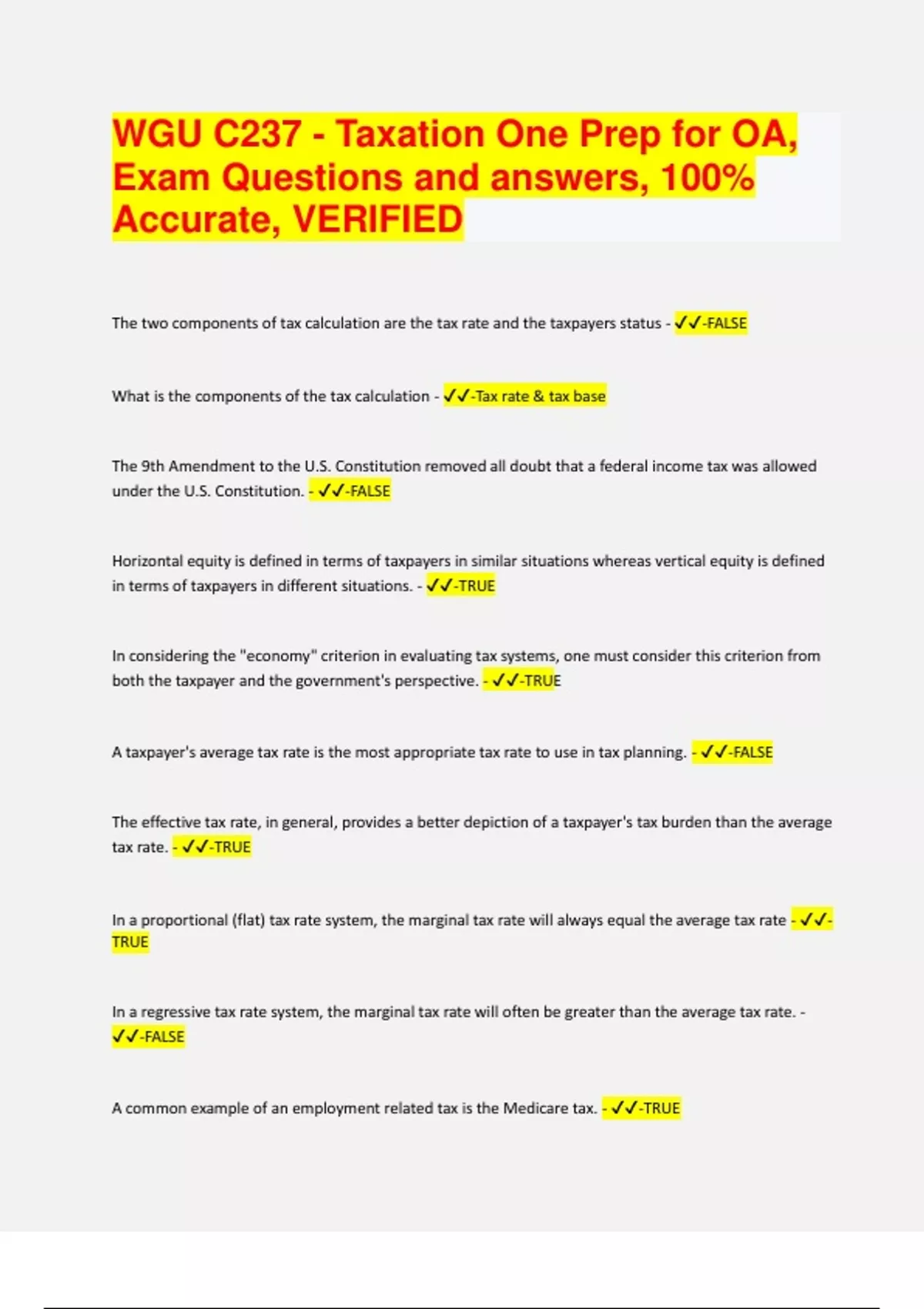 WGU C237 - Taxation One Prep for OA, Exam Questions and answers, 100% Accurate, VERIFIED 2024