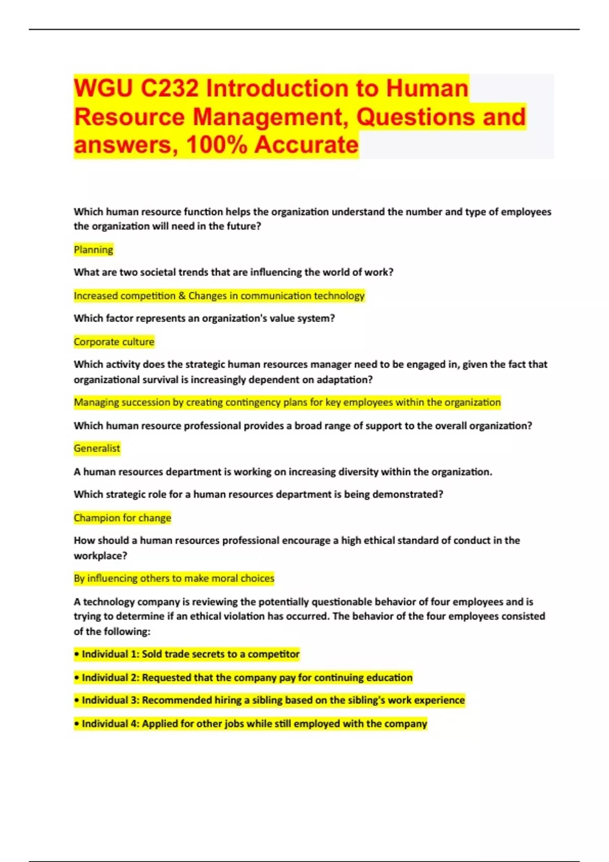 WGU C232 Introduction to Human Resource Management, Questions and answers, 100% Accurate 2024