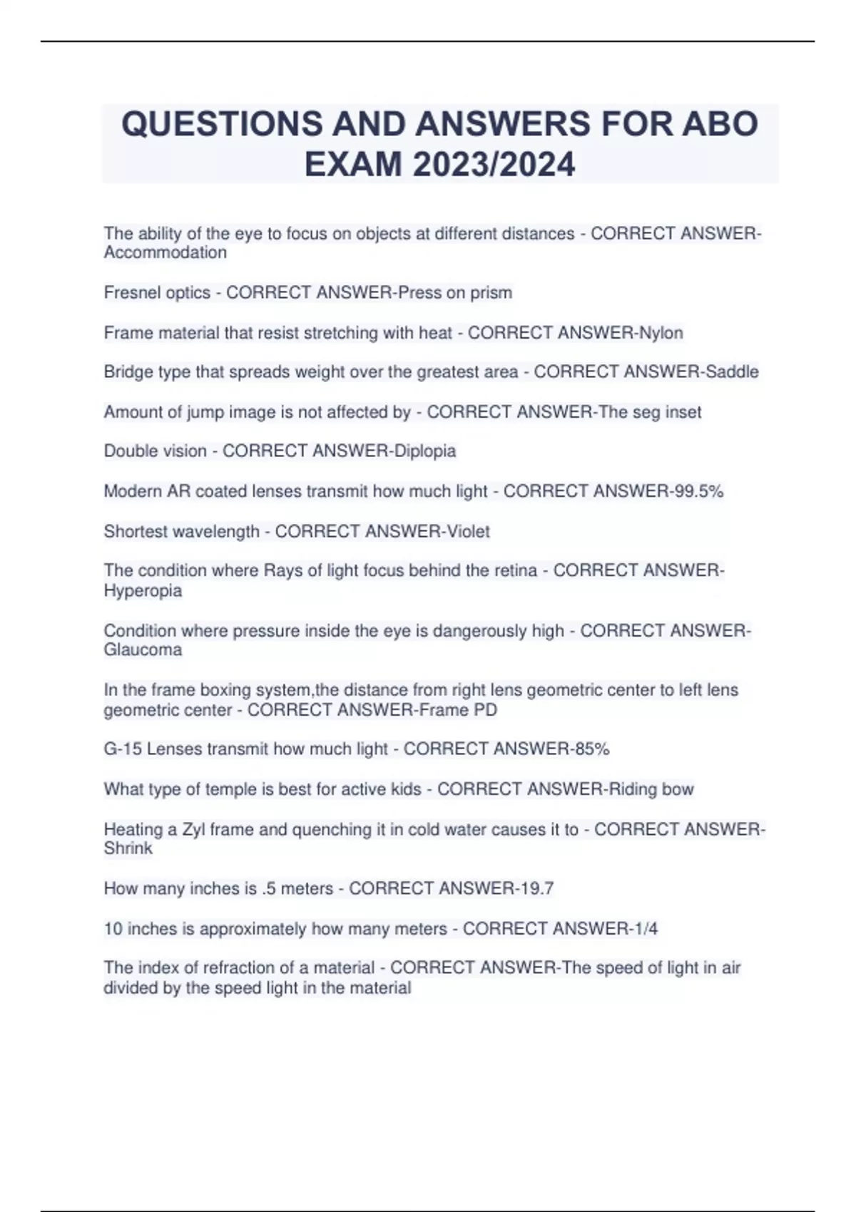 QUESTIONS AND ANSWERS FOR ABO EXAM 2023/2024 The ability of the eye to focus on objects at different distances - CORRECT ANSWERAccommodation Fresnel optics - CORRECT ANSWER-Press on prism Frame material that resist stretching with heat - CORRECT ANSWER-Nylon Bridge type that spreads weight over the greatest area - CORRECT ANSWER-Saddle Amount of jump image is not affected by - CORRECT ANSWER-The seg inset Double vision - CORRECT ANSWER-Diplopia Modern AR coated lenses transmit how much light - CORRECT ANSWER-99.5% Shortest wavelength - CORRECT ANSWER-Violet The condition where Rays of light focus behind the retina - CORRECT ANSWERHyperopia Condition where pressure inside the eye is dangerously high - CORRECT ANSWERGlaucoma In the frame boxing system,the distance from right lens geometric center to left lens geometric center - CORRECT ANSWER-Frame PD G-15 Lenses transmit how much light - CORRECT ANSWER-85% What type of temple is best for active kids - CORRECT ANSWER-Riding bow Heating a Zyl frame and quenching it in cold water causes it to - CORRECT ANSWERShrink How many inches is .5 meters - CORRECT ANSWER-19.7 10 inches is approximately how many meters - CORRECT ANSWER-1/4 The index of refraction of a material - CORRECT ANSWER-The speed of light in air divided by the speed light in the material The multiple anti reflective of an AR lens stack are designed to - CORRECT ANSWERCause destructive interference to different light colors What kind of distortion is characteristic of a high minus lens - CORRECT ANSWERBarrel When calculating vertical imbalance, what does NOT need to be considered - CORRECT ANSWER-Cylinder power in the 90 degree meridian The index of refraction is lowest in - CORRECT ANSWER-Air Light changing direction when passing from one clear medium to another - CORRECT ANSWER-Refraction The wave particle duality means that light - CORRECT ANSWER-Displays both particle and wave behavior Cloudiness of the crystalline lens - CORRECT ANSWER-Cataract A patient with a PD of 65 chooses a 54-18 frame. What will the decentration be in each eye - CORRECT ANSWER-3.5mm in Patient PD > - CORRECT ANSWER-Decentration is out Patient PD < - CORRECT ANSWER-Decentration is in Light passing through a prism is bent toward - CORRECT ANSWER-Base What type of lens surface cannot be accurately measured with a lens clock - CORRECT ANSWER-Aspheric Which has the longest wavelength - CORRECT ANSWER-Red The wavelengths of light visible to humans is between - CORRECT ANSWER-380 and 750 nonometers A -6.50 lens decentered 2 mm results and how much prism - CORRECT ANSWER-1.3 Lens power tolerance standards are defined by - CORRECT ANSWER-ANSI The agency that regulates eye glasses and contact lenses - CORRECT ANSWER-FDA What is the minimum center thickness for a minus lens in a pair of industrial safety glasses - CORRECT ANSWER-3.0 mm