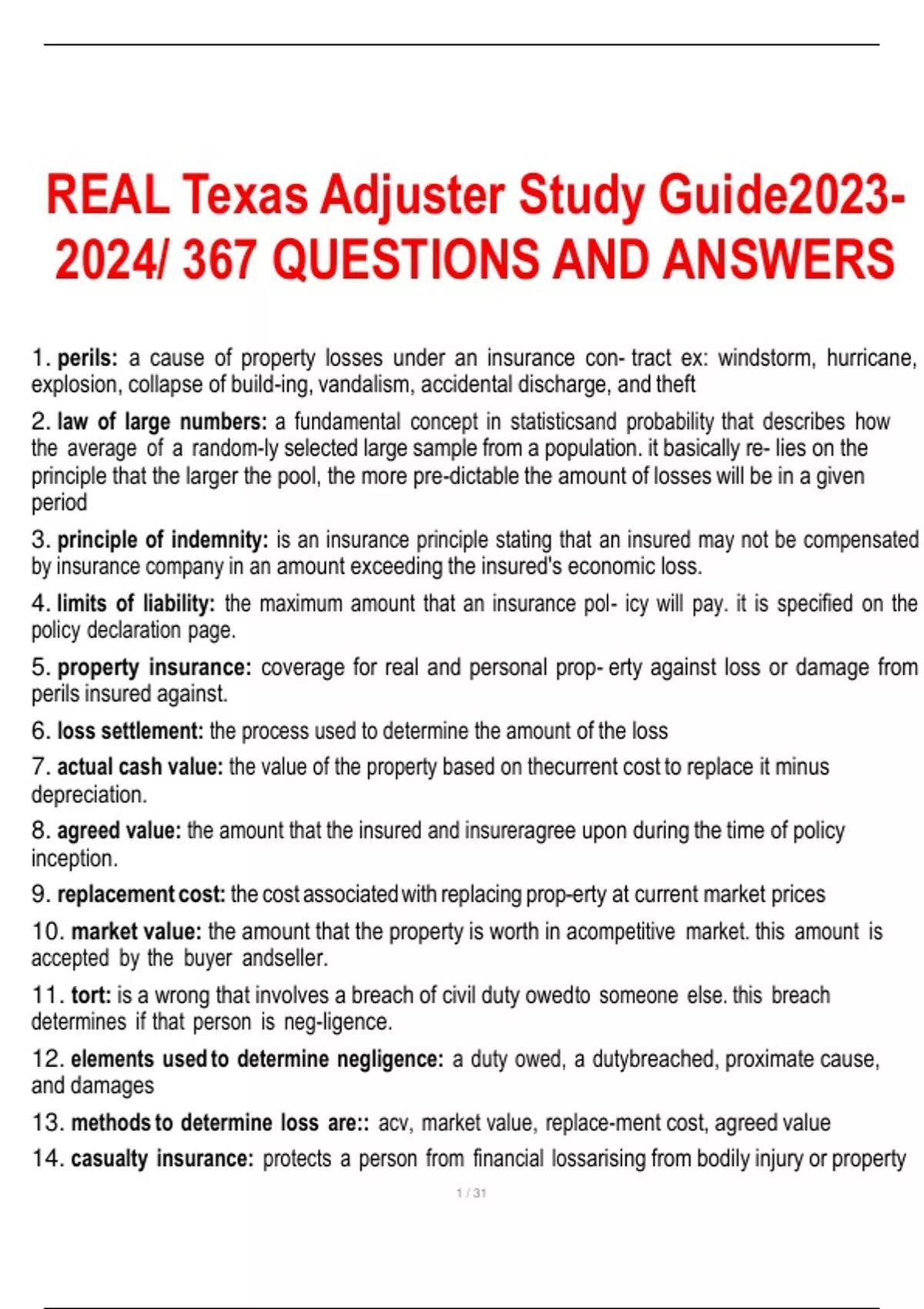 REAL Texas Adjuster Study Guide/ 367 QUESTIONS AND ANSWERS.
