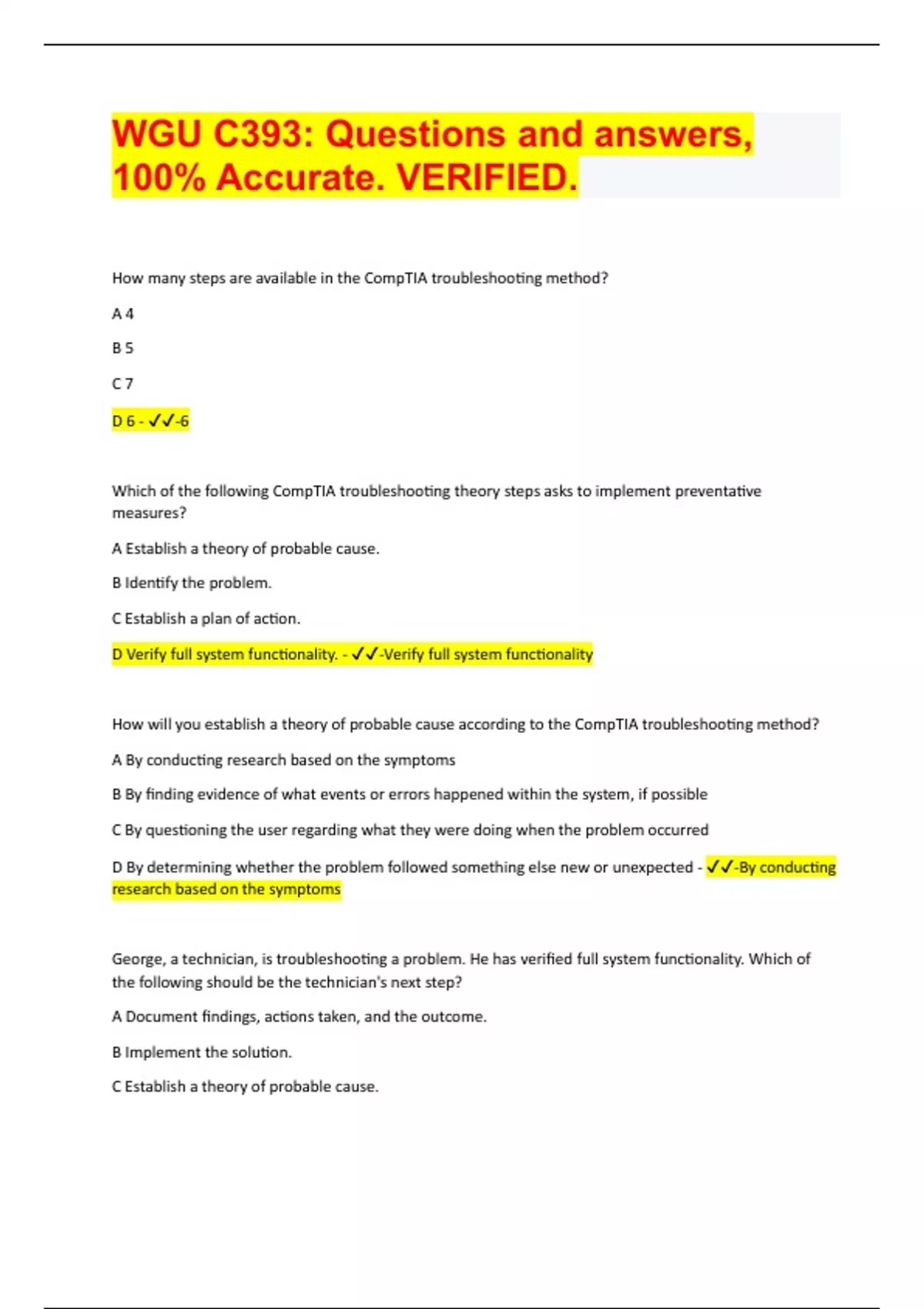 How many steps are available in the CompTIA troubleshooting method? A 4 B 5 C 7 D 6 - -6 Which of the following CompTIA troubleshooting theory steps asks to implement preventative measures? A Establish a theory of probable cause. B Identify the problem. C Establish a plan of action. D Verify full system functionality. - -Verify full system functionality How will you establish a theory of probable cause according to the CompTIA troubleshooting method? A By conducting research based on the symptoms B By finding evidence of what events or errors happened within the system, if possible C By questioning the user regarding what they were doing when the problem occurred D By determining whether the problem followed something else new or unexpected - -By conducting research based on the symptoms George, a technician, is troubleshooting a problem. He has verified full system functionality. Which of the following should be the technician's next step? A Document findings, actions taken, and the outcome. B Implement the solution. C Establish a theory of probable cause.