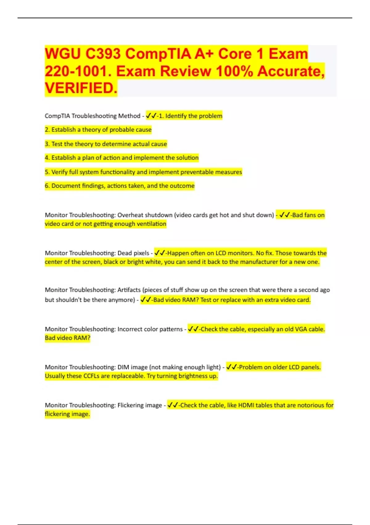 CompTIA Troubleshooting Method - -1. Identify the problem 2. Establish a theory of probable cause 3. Test the theory to determine actual cause 4. Establish a plan of action and implement the solution 5. Verify full system functionality and implement preventable measures 6. Document findings, actions taken, and the outcome Monitor Troubleshooting: Overheat shutdown (video cards get hot and shut down) - -Bad fans on video card or not getting enough ventilation Monitor Troubleshooting: Dead pixels - -Happen often on LCD monitors. No fix. Those towards the center of the screen, black or bright white, you can send it back to the manufacturer for a new one. Monitor Troubleshooting: Artifacts (pieces of stuff show up on the screen that were there a second ago but shouldn't be there anymore) - -Bad video RAM? Test or replace with an extra video card. Monitor Troubleshooting: Incorrect color patterns - -Check the cable, especially an old VGA cable. Bad video RAM? Monitor Troubleshooting: DIM image (not making enough light) - -Problem on older LCD panels. Usually these CCFLs are replaceable. Try turning brightness up.