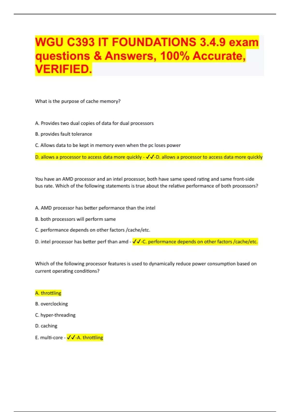 What is the purpose of cache memory? A. Provides two dual copies of data for dual processors B. provides fault tolerance C. Allows data to be kept in memory even when the pc loses power D. allows a processor to access data more quickly - -D. allows a processor to access data more quickly You have an AMD processor and an intel processor, both have same speed rating and same front-side bus rate. Which of the following statements is true about the relative performance of both processors? A. AMD processor has better peformance than the intel B. both processors will perform same C. performance depends on other factors /cache/etc. D. intel processor has better perf than amd - -C. performance depends on other factors /cache/etc. Which of the following processor features is used to dynamically reduce power consumption based on current operating conditions? A. throttling B. overclocking C. hyper-threading D. caching E. multi-core - -A. throttling