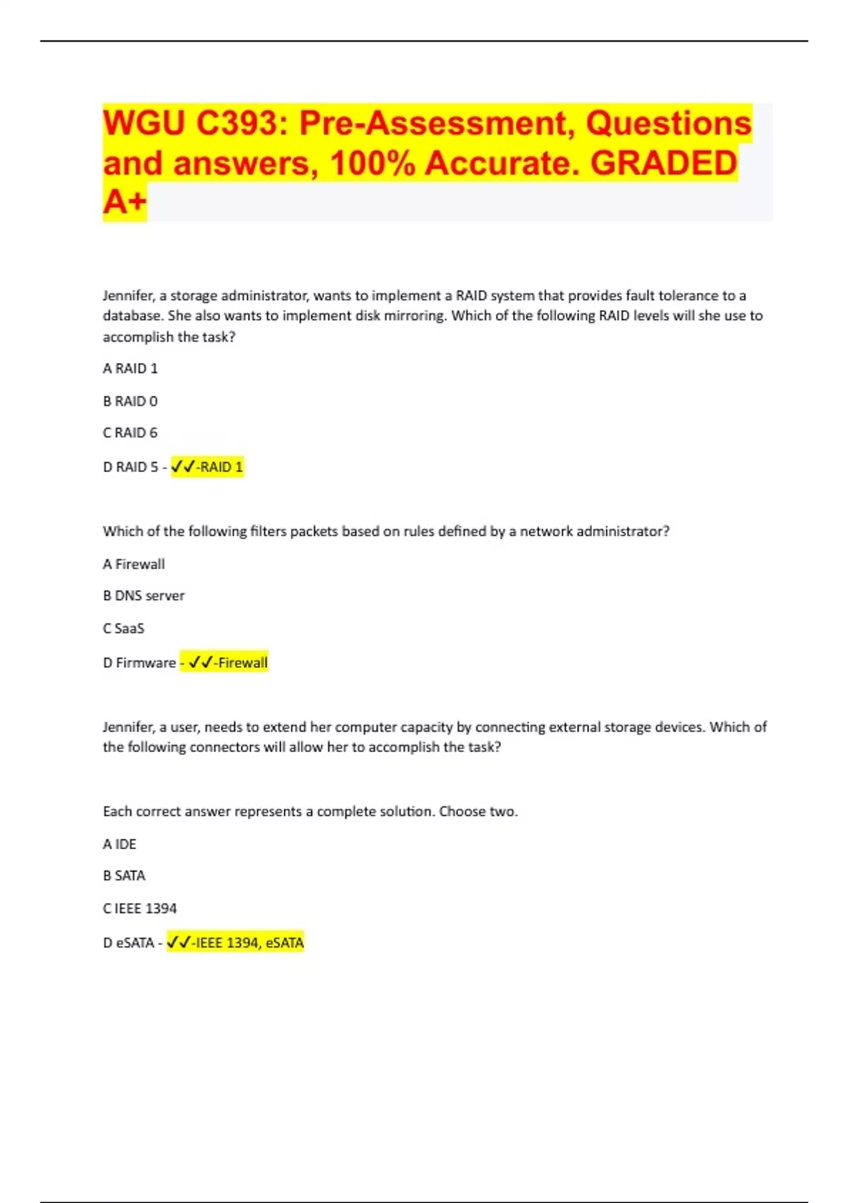 Jennifer, a storage administrator, wants to implement a RAID system that provides fault tolerance to a database. She also wants to implement disk mirroring. Which of the following RAID levels will she use to accomplish the task? A RAID 1 B RAID 0 C RAID 6 D RAID 5 - -RAID 1 Which of the following filters packets based on rules defined by a network administrator? A Firewall B DNS server C SaaS D Firmware - -Firewall Jennifer, a user, needs to extend her computer capacity by connecting external storage devices. Which of the following connectors will allow her to accomplish the task? Each correct answer represents a complete solution. Choose two. A IDE B SATA C IEEE 1394 D eSATA - -IEEE 1394, eSATA