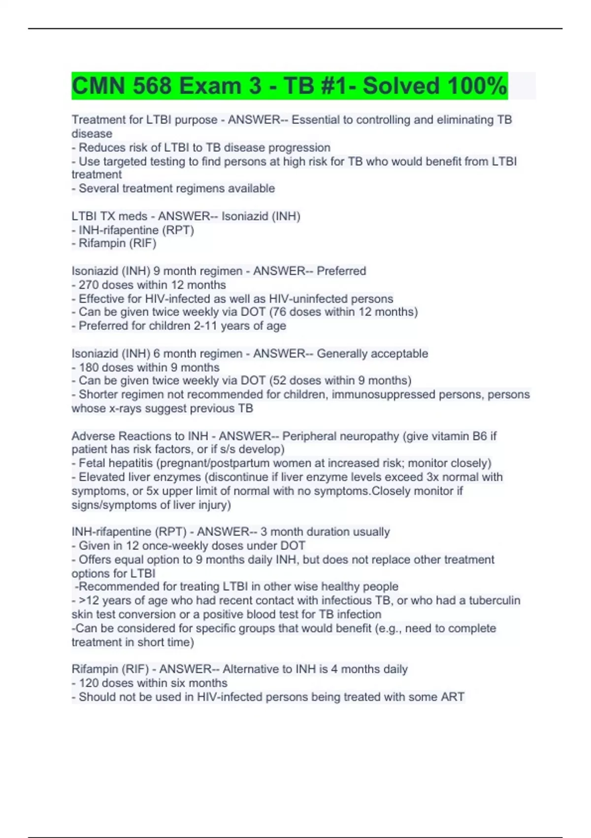 Treatment for LTBI purpose - ANSWER-- Essential to controlling and eliminating TB disease - Reduces risk of LTBI to TB disease progression - Use targeted testing to find persons at high risk for TB who would benefit from LTBI treatment - Several treatment regimens available LTBI TX meds - ANSWER-- Isoniazid (INH) - INH-rifapentine (RPT) - Rifampin (RIF) Isoniazid (INH) 9 month regimen - ANSWER-- Preferred - 270 doses within 12 months - Effective for HIV-infected as well as HIV-uninfected persons - Can be given twice weekly via DOT (76 doses within 12 months) - Preferred for children 2-11 years of age Isoniazid (INH) 6 month regimen - ANSWER-- Generally acceptable - 180 doses within 9 months - Can be given twice weekly via DOT (52 doses within 9 months) - Shorter regimen not recommended for children, immunosuppressed persons, persons whose x-rays suggest previous TB Adverse Reactions to INH - ANSWER-- Peripheral neuropathy (give vitamin B6 if patient has risk factors, or if s/s develop) - Fetal hepatitis (pregnant/postpartum women at increased risk; monitor closely) - Elevated liver enzymes (discontinue if liver enzyme levels exceed 3x normal with symptoms, or 5x upper limit of normal with no symptoms.Closely monitor if signs/symptoms of liver injury) INH-rifapentine (RPT) - ANSWER-- 3 month duration usually - Given in 12 once-weekly doses under DOT - Offers equal option to 9 months daily INH, but does not replace other treatment options for LTBI -Recommended for treating LTBI in other wise healthy people - 12 years of age who had recent contact with infectious TB, or who had a tuberculin skin test conversion or a positive blood test for TB infection -Can be considered for specific groups that would benefit (e.g., need to complete treatment in short time) Rifampin (RIF) - ANSWER-- Alternative to INH is 4 months daily - 120 doses within six months - Should not be used in HIV-infected persons being treated with some ART