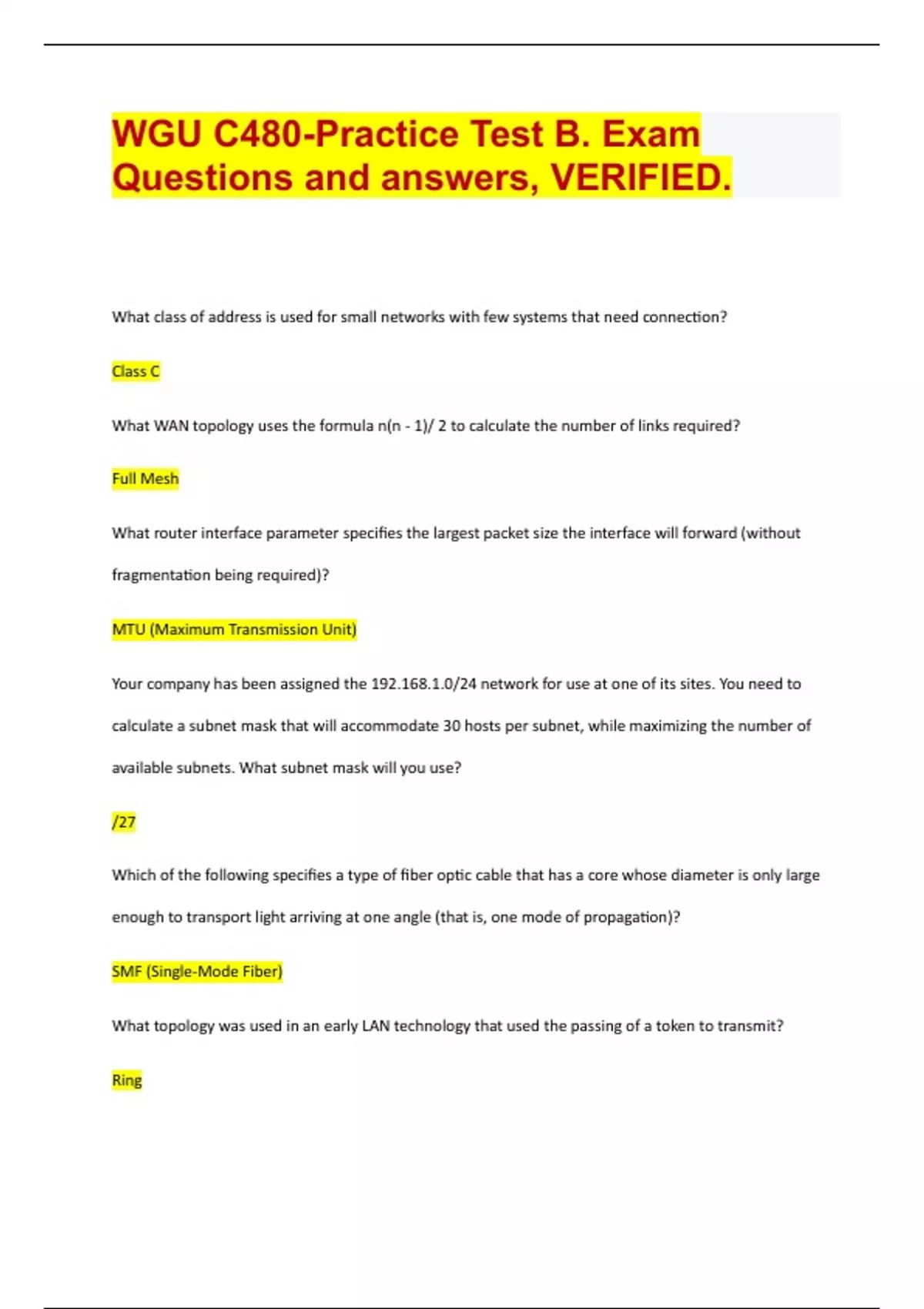 What class of address is used for small networks with few systems that need connection? Class C What WAN topology uses the formula n(n - 1)/ 2 to calculate the number of links required? Full Mesh What router interface parameter specifies the largest packet size the interface will forward (without fragmentation being required)? MTU (Maximum Transmission Unit) Your company has been assigned the 192.168.1.0/24 network for use at one of its sites. You need to calculate a subnet mask that will accommodate 30 hosts per subnet, while maximizing the number of available subnets. What subnet mask will you use? /27 Which of the following specifies a type of fiber optic cable that has a core whose diameter is only large enough to transport light arriving at one angle (that is, one mode of propagation)? SMF (Single-Mode Fiber) What topology was used in an early LAN technology that used the passing of a token to transmit? Ring