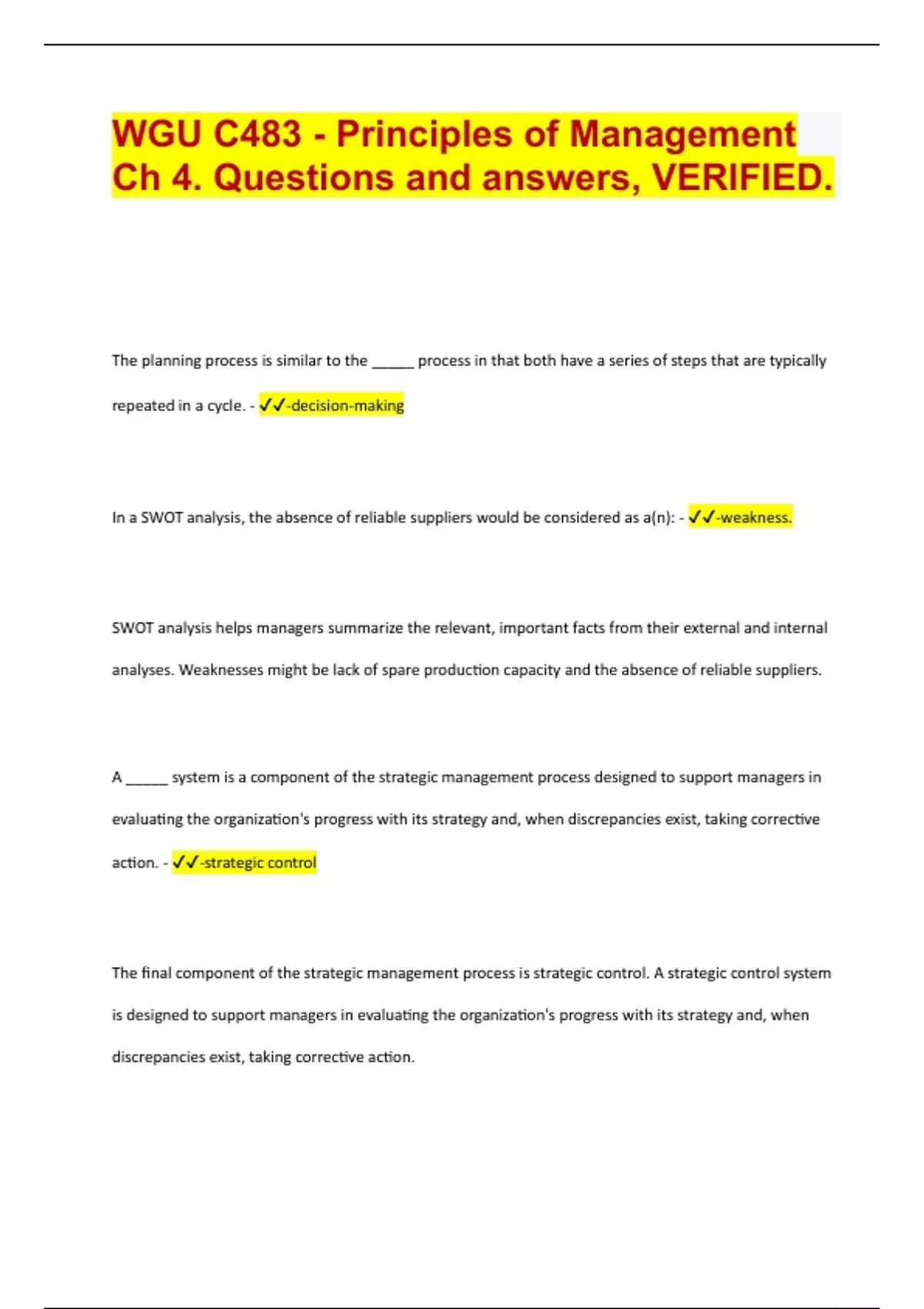 The planning process is similar to the _____ process in that both have a series of steps that are typically repeated in a cycle. - -decision-making In a SWOT analysis, the absence of reliable suppliers would be considered as a(n): - -weakness. SWOT analysis helps managers summarize the relevant, important facts from their external and internal analyses. Weaknesses might be lack of spare production capacity and the absence of reliable suppliers. A _____ system is a component of the strategic management process designed to support managers in evaluating the organization's progress with its strategy and, when discrepancies exist, taking corrective action. - -strategic control The final component of the strategic management process is strategic control. A strategic control system is designed to support managers in evaluating the organization's progress with its strategy and, when discrepancies exist,