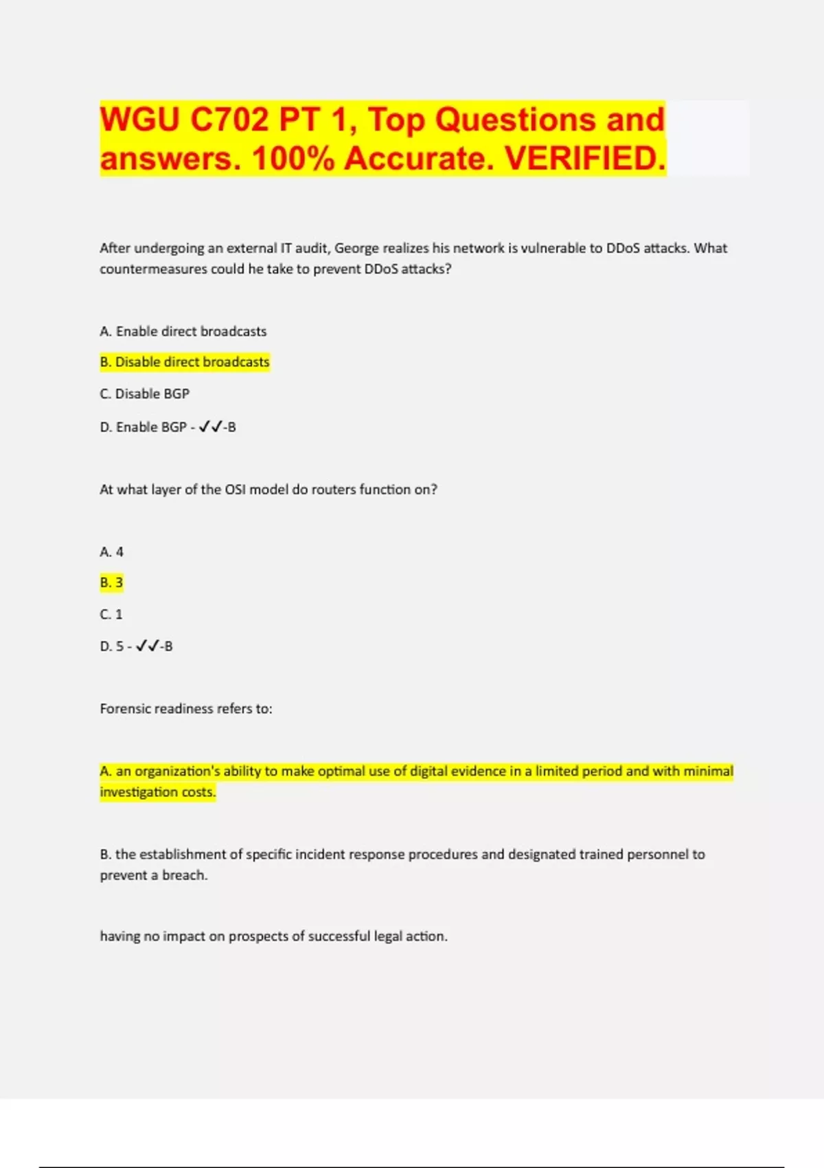 After undergoing an external IT audit, George realizes his network is vulnerable to DDoS attacks. What countermeasures could he take to prevent DDoS attacks? A. Enable direct broadcasts B. Disable direct broadcasts C. Disable BGP D. Enable BGP - -B At what layer of the OSI model do routers function on? A. 4 B. 3 C. 1 D. 5 - -B Forensic readiness refers to: A. an organization's ability to make optimal use of digital evidence in a limited period and with minimal investigation costs. B. the establishment of specific incident response procedures and designated trained personnel to prevent a breach. having no impact on prospects of successful legal action
