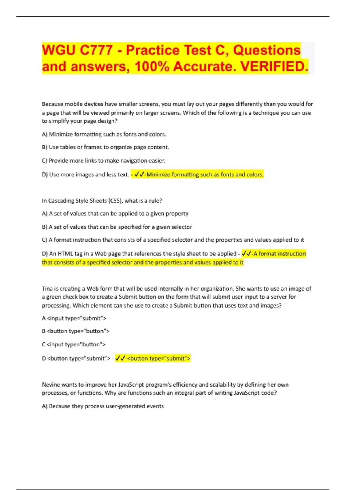 Because mobile devices have smaller screens, you must lay out your pages differently than you would for a page that will be viewed primarily on larger screens. Which of the following is a technique you can use to simplify your page design? A) Minimize formatting such as fonts and colors. B) Use tables or frames to organize page content. C) Provide more links to make navigation easier. D) Use more images and less text. - -Minimize formatting such as fonts and colors. In Cascading Style Sheets (CSS), what is a rule? A) A set of values that can be applied to a given property B) A set of values that can be specified for a given selector C) A format instruction that consists of a specified selector and the properties and values applied to it D) An HTML tag in a Web page that references the style sheet to be applied - -A format instruction that consists of a specified selector and the properties and values applied to it Tina is creating a Web form that will be used internally in her organization. She wants to use an image of a green check box to create a Submit button on the form that will submit user input to a server for processing. Which element can she use to create a Submit button that uses text and images? A <input type="submit"> B <button type="button"> C <input type="button"> D <button type="submit"> - -<button type="submit"> Nevine wants to improve her JavaScript program's efficiency and scalability by defining her own processes, or functions. Why are functions such an integral part of writing JavaScript code? A) Because they process user-generated events