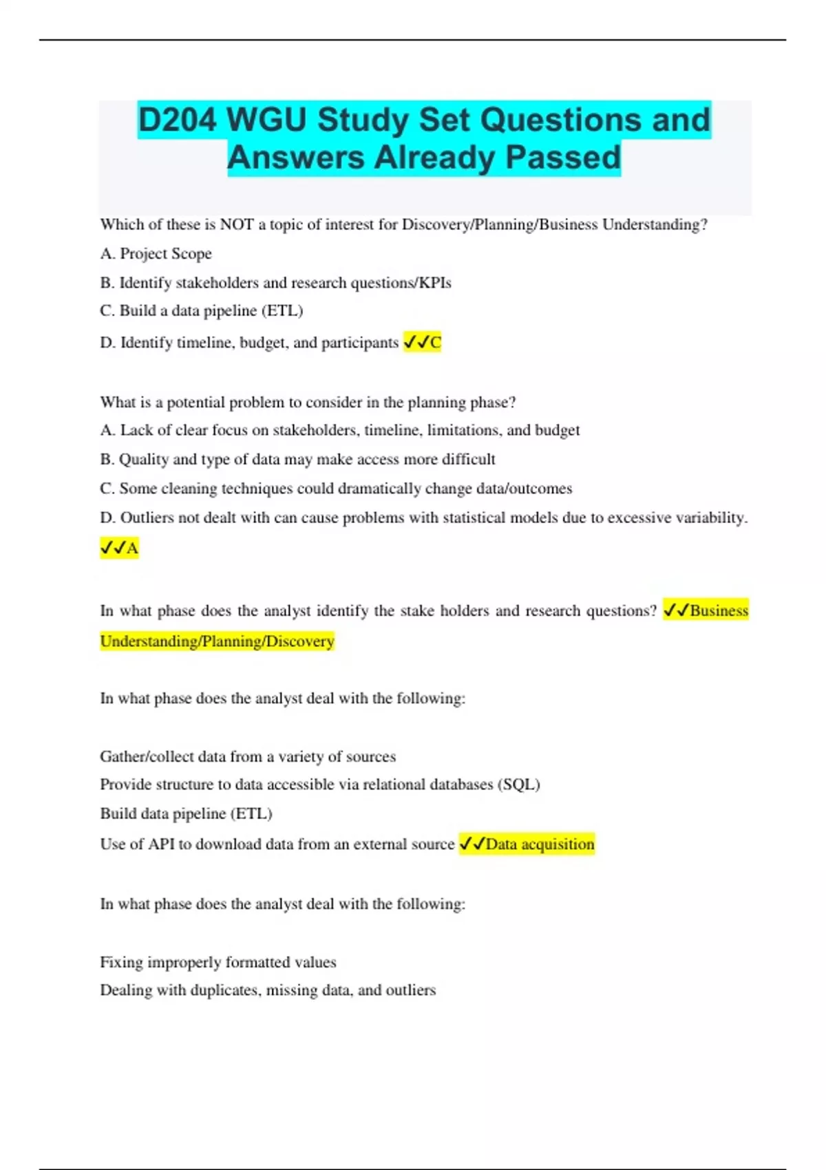 Which of these is NOT a topic of interest for Discovery/Planning/Business Understanding? A. Project Scope B. Identify stakeholders and research questions/KPIs C. Build a data pipeline (ETL) D. Identify timeline, budget, and participants C What is a potential problem to consider in the planning phase? A. Lack of clear focus on stakeholders, timeline, limitations, and budget B. Quality and type of data may make access more difficult C. Some cleaning techniques could dramatically change data/outcomes D. Outliers not dealt with can cause problems with statistical models due to excessive variability. A In what phase does the analyst identify the stake holders and research questions? Business Understanding/Planning/Discovery In what phase does the analyst deal with the following: Gather/collect data from a variety of sources Provide structure to data accessible via relational databases (SQL) Build data pipeline (ETL) Use of API to download data from an external source Data acquisition In what phase does the analyst deal with the following: Fixing improperly formatted values Dealing with duplicates, missing data, and outliers