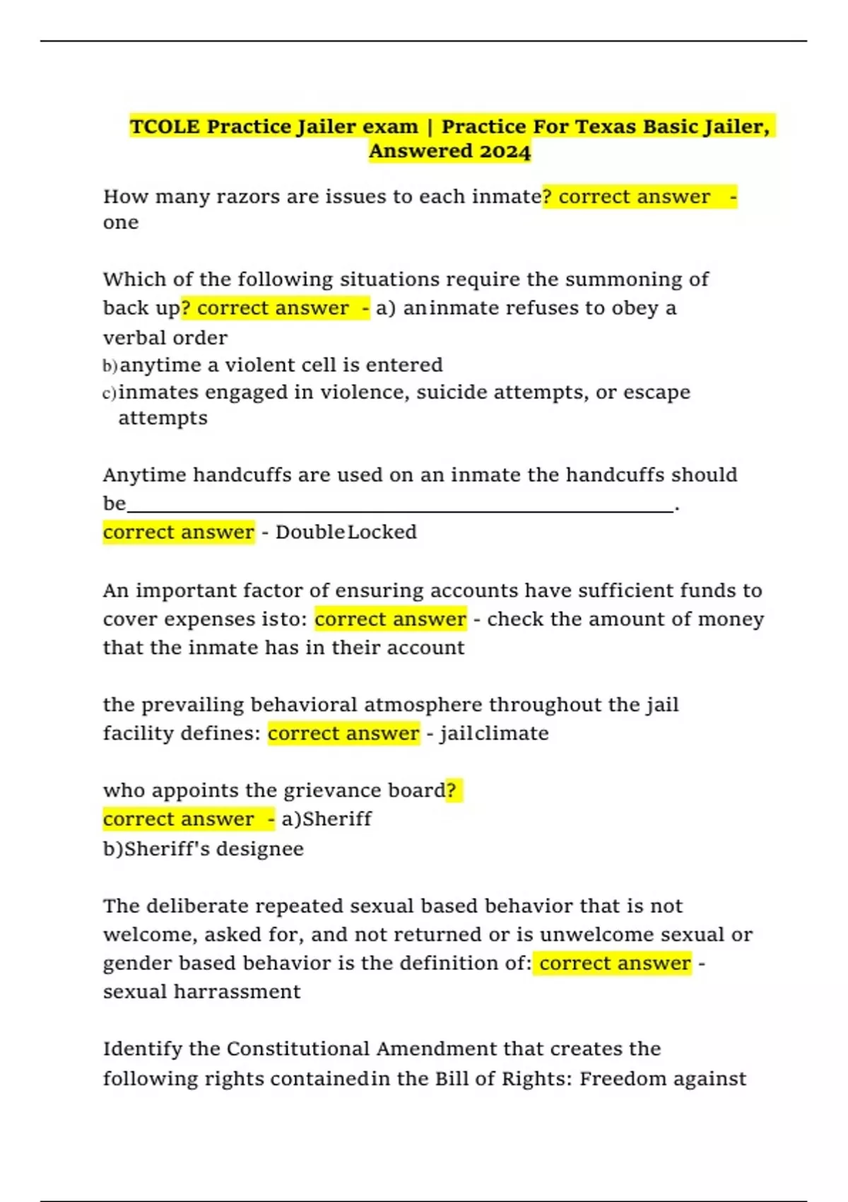 TCOLE Practice Jailer exam | Practice For Texas Basic Jailer (Answered) 2024 How many razors are issues to each inmate? correct answer - one Which of the following situations require the summoning of back up? correct answer - a) an inmate refuses to obey a verbal order b) anytime a violent cell is entered c) inmates engaged in violence, suicide attempts, or escape attempts Anytime handcuffs are used on an inmate the handcuffs should be . correct answer - Double Locked