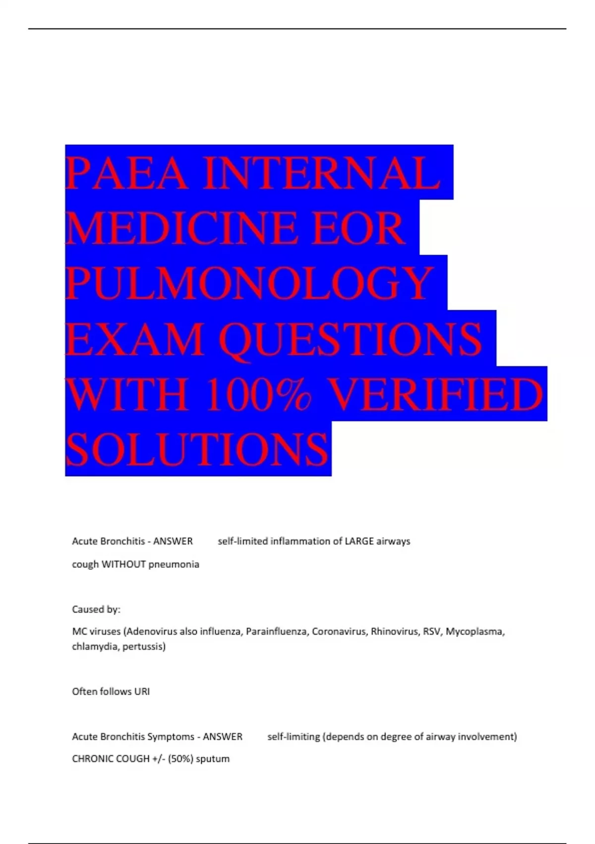 PAEA INTERNAL MEDICINE EOR PULMONOLOGY EXAM QUESTIONS WITH 100% VERIFIED SOLUTIONS Acute Bronchitis - ANSWER self-limited inflammation of LARGE airways cough WITHOUT pneumonia Caused by: MC viruses (Adenovirus also influenza, Parainfluenza, Coronavirus, Rhinovirus, RSV, Mycoplasma, chlamydia, pertussis) Often follows URI Acute Bronchitis Symptoms - ANSWER self-limiting (depends on degree of airway involvement) CHRONIC COUGH +/- (50%) sputum Actue Bronchitis Dx - ANSWER usually clinical* cough NO FEVER tachycardic/tachypnea(SOB) normal vitals NO RALES/CRACKLES/EGOPHONY IMAGING: CXR: will be nonspecific/nl done to R/O pneumonia Acute Bronchitis Tx - ANSWER MAINLY SUPPORTIVE CARE NO ANTIBIOTICS ARE RECOMMENDED IN MOST CASES (because most often viral cause) Influenza - ANSWER Acute respiratory illness caused by influenza A or B viruses with outbreaks mainly in fall/winter. Respiratory droplet nuclei transmission Influenza Sx - ANSWER ABRUPT fever 3-5 days, headache, myalgia, arthralgias, malaise (full body aches and pains) NON-productive dry cough (NO ronchi), sore throat, NO nasal cong., PE: generally respiratory exam unremarkable unless complications (pneumonia) Influenza complications - ANSWER MC complication is pneumonia Influenza prevention - ANSWER 1. Trivalent inactivated influenza virus vaccine