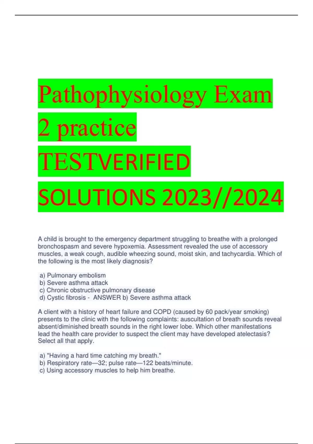 Pathophysiology Exam 2 practice TESTVERIFIED SOLUTIONS 2023//2024 A child is brought to the emergency department struggling to breathe with a prolonged bronchospasm and severe hypoxemia. Assessment revealed the use of accessory muscles, a weak cough, audible wheezing sound, moist skin, and tachycardia. Which of the following is the most likely diagnosis? a) Pulmonary embolism b) Severe asthma attack c) Chronic obstructive pulmonary disease d) Cystic fibrosis - ANSWER b) Severe asthma attack A client with a history of heart failure and COPD (caused by 60 pack/year smoking) presents to the clinic with the following complaints: auscultation of breath sounds reveal absent/diminished breath sounds in the right lower lobe. Which other manifestations lead the health care provider to suspect the client may have developed atelectasis? Select all that apply. a) "Having a hard time catching my breath." b) Respiratory rate—32; pulse rate—122 beats/minute. c) Using accessory muscles to help him breathe. d) "Seems like I'm not making much water (decreased urine production)." e) Copious amounts of thick, green sputum. - ANSWER a) "Having a hard time catching my breath." b) Respiratory rate—32; pulse rate—122 beats/minute. c) Using accessory muscles to help him breathe. The nurse is caring for the following clients. Select the client at highest risk for the development of atelectasis. a) The client who is mobile within 24 hours after abdominal surgery b) The client who is postop total knee replacement and receiving client-controlled analgesia c) The client with a lower leg cast who changes position every 2 hours d) The client diagnosed with pneumonia who performs frequent coughing and deep breathing exercises - ANSWER b) The client who is postop total knee replacement and receiving client-controlled analgesia Cystic fibrosis (CF) is an autosomal recessive disorder involving the secretion of fluids in specific exocrine glands. The genetic defect in CF inclines a person to chronic respiratory infections from a small group of organisms. Which organisms create chronic infection in a child with cystic fibrosis? a) Staphylococcus aureus and hepatitis C b) Pseudomonas aeruginosa and Escherichia coli c) Haemophilus influenzae and influenza A d) Pseudomonas aeruginosa and Staphylococcus aureus - ANSWER d) Pseudomonas aeruginosa and Staphylococcus aureus The health care provider suspects a newly admitted client may have a hemothorax. The client most likely experienced: a) Renal failure b) Pneumonia c) Congestive heart failure d) Fractured or dislocated ribs - ANSWER d) Fractured or dislocated ribs Unilateral chest pain associated with respiratory movements is usually described as which of the following? a) Bronchitic b) Myocardial c) Pleuritic d) Musculoskeletal - ANSWER c) Pleuritic A car accident client is admitted with a chest tube following pneumothorax. He also has an elevated blood alcohol level. When the nurse enters his room, she notes the client is dyspneic, short of breath, and holding his chest tube in his hand. When the nurse pulls the linens back, she finds a "sucking" chest wound. After calling a "code blue," the next priority intervention would be to: a) Try to calm the patient down by maintaining therapeutic communication b) Apply a Vaseline gauze (airtight) dressing over the insertion site c) Observe and wait for the code blue team to bring equipment d) Place the client's meal napkin over the wound - ANSWER b) Apply a Vaseline gauze (airtight) dressing over the insertion site An elderly client who has been restricted to bed by numerous comorbidities for several weeks has been diagnosed with a large pleural effusion. Which of the following treatment modalities is most likely to resolve the client's most recent health problem? a) Thoracentesis b) Supplementary oxygen therapy c) Administration of bronchodilators d) Administration of corticosteroids - ANSWER a) Thoracentesis Acute-onset bronchial asthma causes wheezing and breathlessness as a result of which of the following? a) Pulmonary hypertension b) Alveolar collapse c) Compression atelectasis d) Airway inflammation - ANSWER d) Airway inflammation