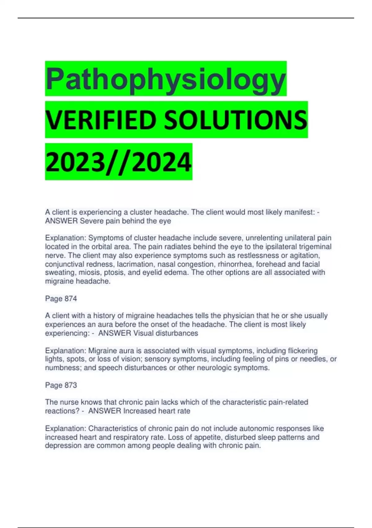 Pathophysiology VERIFIED SOLUTIONS 2023//2024 A client is experiencing a cluster headache. The client would most likely manifest: - ANSWER Severe pain behind the eye Explanation: Symptoms of cluster headache include severe, unrelenting unilateral pain located in the orbital area. The pain radiates behind the eye to the ipsilateral trigeminal nerve. The client may also experience symptoms such as restlessness or agitation, conjunctival redness, lacrimation, nasal congestion, rhinorrhea, forehead and facial sweating, miosis, ptosis, and eyelid edema. The other options are all associated with migraine headache. Page 874 A client with a history of migraine headaches tells the physician that he or she usually experiences an aura before the onset of the headache. The client is most likely experiencing: - ANSWER Visual disturbances Explanation: Migraine aura is associated with visual symptoms, including flickering lights, spots, or loss of vision; sensory symptoms, including feeling of pins or needles, or numbness; and speech disturbances or other neurologic symptoms. Page 873 The nurse knows that chronic pain lacks which of the characteristic pain-related reactions? - ANSWER Increased heart rate Explanation: Characteristics of chronic pain do not include autonomic responses like increased heart and respiratory rate. Loss of appetite, disturbed sleep patterns and depression are common among people dealing with chronic pain. Page 866 When conducting a health assessment that focuses on the pain experienced by an older client diagnosed with early dementia, the nurse will pay particular attention to which of the following? - ANSWER Behavioral signs of pain demonstrated by the client Explanation: The assessment of pain in older adults can range from relatively simple in a well-informed, alert, cognitively intact person with pain from a single source and no comorbidities to extraordinarily difficult in a confused person. When possible, a person's report of pain is the gold standard, but behavioral signs of pain should also be considered. This is especially true when the client's cognitive function is impaired. While the other options should be considered, the client's non verbal behaviors should be of particular interest to the nurse. Page 876 A mother is placing her child into the bathtub. The child immediately jumps out of the tub and begins to cry, stating their feet are 'burning'. The nurse in the emergency department knows that the child's response is based on which of the following pathophysiological principles listed below? - ANSWER The tactile sensation occurs well in advance of the burning sensation. The local withdrawal reflex reacts first. Explanation: If a person places a foot in a tub of hot water, the tactile sensation occurs well in advance of the burning sensation. The foot has been removed from the hot water by the local withdrawal reflex well before the excessive heat is perceived by the forebrain. All other responses are incorrect. Page 858 A 58-year-old woman comes to the clinic for evaluation of a sharp, intermittent, severe, stabbing facial pain that she describes as, "like an electric shock." The pain occurs only on one side of her face; it seems to be triggered when she chews, brushes her teeth, or sometimes when she merely touches her face. There is no numbness associated with the pain. What is most likely causing her pain? - ANSWER Trigeminal neuralgia Explanation: Her symptoms are characteristic of trigeminal neuralgia, caused by damage to the fifth cranial nerve, which carries impulses of touch, pain, pressure, and temperature to the brain from the face and jaw. Page 870 A 7 year old child had an emergency appendectomy during the night. When trying to assess their pain, the nurse should: - ANSWER Show them a scale with faces of actual children and have them point to the picture that best describes how they are feeling. Explanation: Children do feel pain and have been shown to reliably and accurately report pain...With children 3-8 years of age, scales with faces of actual children or cartoon faces can be used to obtain a report of pain. Physiologic measures, such as heart rate, are convenient to measure but they are nonspecific. They may be a sign of anxiety and not pain. Distraction methods are good but medications should be used on an individual basis to match the analgesic agent with the level of pain. Page 875 Which is considered the most accurate method of assessing pain in children ages 8 years and older? - ANSWER Using a numeric 1-10 scale Explanation: Children between ages 3 and 8 years can accurately point to a scale of faces that ranges from very tearful to very happy to indicate their pain level. Children older than 8 are accurately able to report pain on a numeric scale, or using words ranging from "none" to "the most I have ever had." The older child may consider the faces scale juvenile. Physiologic responses to pain, such as tachycardia and guarding, are not very accurate because they are nonspecific and may not occur with chronic pain. A parent may say that their child is acting differently, but the child is the best person to describe his or her pain. Page 876 A client is admitted to the acute care facility with severe pain in the abdomen related to inflammatory bowel disease. What type of pain will the nurse be administering medication to relieve? - ANSWER Visceral pain Visceral pain has its origin in the visceral organs and is one of the most common pains produced by disease. While similar to somatic pain in many ways, both the neurologic mechanisms and the perception of visceral pain differ from somatic pain. One of the most important differences between surface pain and visceral pain is the type of damage that causes pain. Strong contractions, distention, or ischemia affecting the walls of the viscera can induce severe pain.