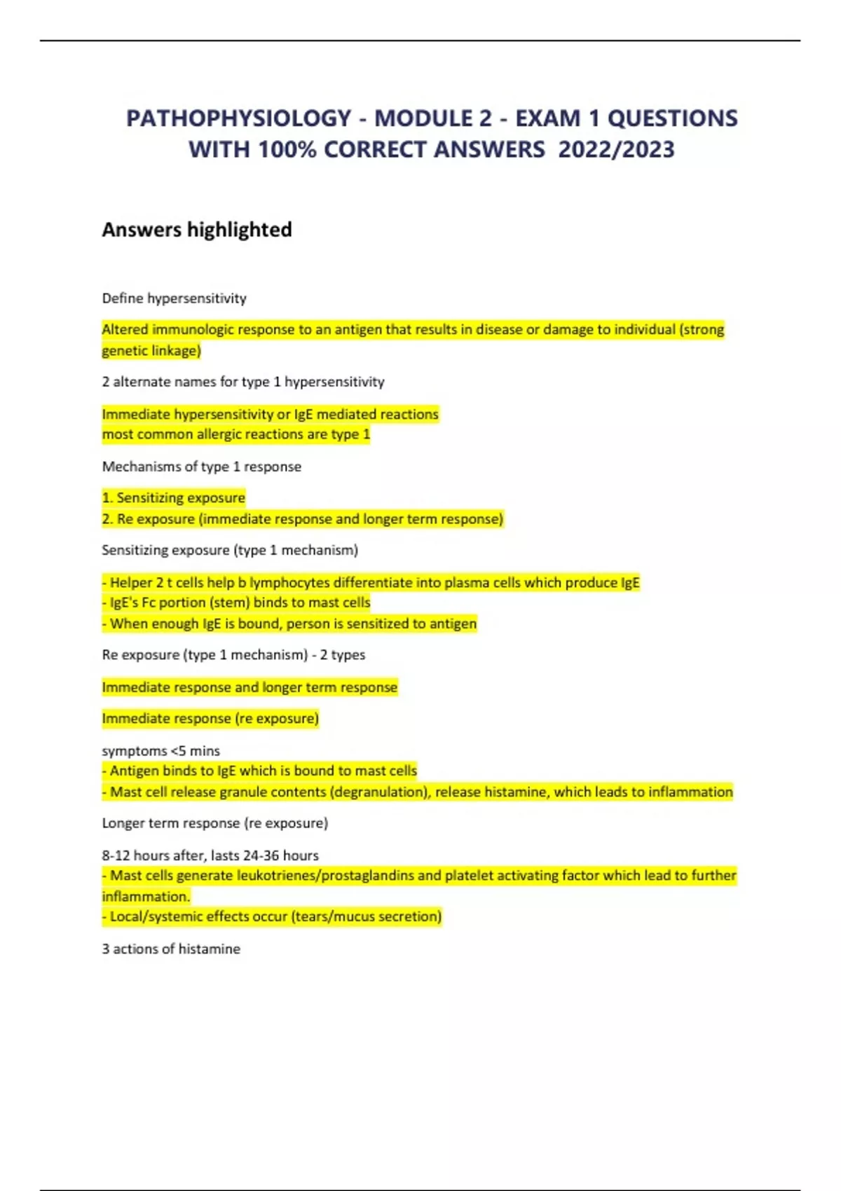 PATHOPHYSIOLOGY - MODULE 2 - EXAM 1 QUESTIONS WITH 100% CORRECT ANSWERS 2022/2023 Answers highlighted Define hypersensitivity Altered immunologic response to an antigen that results in disease or damage to individual (strong genetic linkage) 2 alternate names for type 1 hypersensitivity Immediate hypersensitivity or IgE mediated reactions most common allergic reactions are type 1 Mechanisms of type 1 response 1. Sensitizing exposure 2. Re exposure (immediate response and longer term response) Sensitizing exposure (type 1 mechanism) - Helper 2 t cells help b lymphocytes differentiate into plasma cells which produce IgE - IgE's Fc portion (stem) binds to mast cells - When enough IgE is bound, person is sensitized to antigen Re exposure (type 1 mechanism) - 2 types Immediate response and longer term response Immediate response (re exposure) symptoms <5 mins - Antigen binds to IgE which is bound to mast cells - Mast cell release granule contents (degranulation), release histamine, which leads to inflammation Longer term response (re exposure) 8-12 hours after, lasts 24-36 hours - Mast cells generate leukotrienes/prostaglandins and platelet activating factor which lead to further inflammation. - Local/systemic effects occur (tears/mucus secretion) 3 actions of histamine 1. increases vascular permeability 2. causes vasodilation 3. contracts bronchial smooth muscle tissue What is type 2 hypersensitivity (name) Antibody dependent cytotoxic hypersensitivity Where are antigens located that react with antibodies in type 2 response Ab react to Ag fixed to surface of various body cells/specific tissues Mechanisms of type 2 response (3) 1. cell destruction 2. inflammation 3. altered cell metabolism Cell destruction (type 2 mechanism) Ab (IgG/IgM) bind to Ag on tissue cell surface and: - Cause phagocytosis (opsonization) - Activate complement (result: phagocytosis/cell lysis) - E.g., blood transfusion reaction Inflammation (type 2 mechanism) - When Ab are bound to extracellular connective tissue - Ab activate complement which cause inflammatory response (activating mast cells - releasing histamine and acting as chemokines to attract monocytes/neutrophils) - Cell injury results from release of proteases - E.g., Goodpasture syndrome Altered cell metabolism (type 2 mechanism) - Ab attach to receptors on cell surface which change cell function (2 ways) - 1. Replacing chemical that normally fits in receptor (ligand), which inappropriately stimulates cell (e.g., graves disease - thyroid gland is stimulated inappropriately to produce thyroid hormone) - 2. Blocking/destroying receptor (e.g., myasthenia gravis - acetylcholine receptors on muscle cells are blocked) Where are Ag located that react with Ab in type 3 response Ab-ag complexes formed in circulation then deposited on cell surface Type 3 hypersensitivity (name) Immune complex mediated hypersensitivity General mechanism of type 3 response with example - Antibodies activate complement which: - Attract neutrophils/opsonize tissue - Lysosomal enzymes/inflammatory mediators released by neutrophils to produce inflammation/damage to underlying tissues - Not tissue specific - E.g., Systematic lupus erythematosus (SLE) Ab-Ag in systematic immune complex disorder vs ... Ab-ag complex deposited in wide range of body tissues (e.g., serum sickness) Ab-Ag in localized immune complex disorder Due to injected drug/vaccine/insect bite. Severe in some cases (e.g., Arthus Reaction) Which mechanism causes serum sickness and how is it caused Systematic immune complex disorder. Caused by antibiotics (penicillin), foods, drugs, venom Which mechanism causes Arthus reaction and how is it caused Localized immune complex disorder Caused by injected drug, insect sting, vaccine Type 4 hypersensitivity (name) Cell mediated hypersensitivity