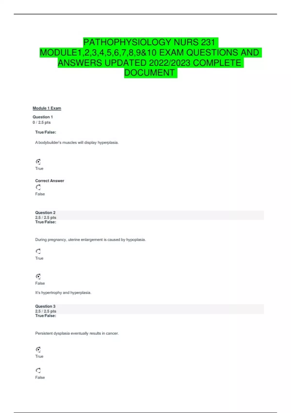 PATHOPHYSIOLOGY NURS 231 MODULE1,2,3,4,5,6,7,8,9&10 EXAM QUESTIONS AND ANSWERS UPDATED 2022/2023 COMPLETE DOCUMENT Module 1 Exam Question 1 0 / 2.5 pts True/False: A bodybuilder’s muscles will display hyperplasia. True Correct Answer False True/False: During pregnancy, uterine enlargement is caused by hypoplasia. True False It’s hypertrophy and hyperplasia. True/False: Persistent dysplasia eventually results in cancer. True False Question 4 0 / 2.5 pts True/False: Endometrial hyperplasia is a normal physiologic occurrence. Question 5 10 / 10 pts c. Sensitivity b. Reliability a. Validity d. Specificity Question 6 2.5 / 2.5 pts True Correct Answer False Match the following: 1. Proportion of people with a disease who are positive for that disease a. Validity 2. How likely the same result will occur if repeated b. Reliability 3. How a tool measures what it is intended to measure c. Sensitivity 4. People without the disease who are negative on a given test d. Specificity Proportion of people with a disease who are positive for that disease How likely the same result will occur if repeated