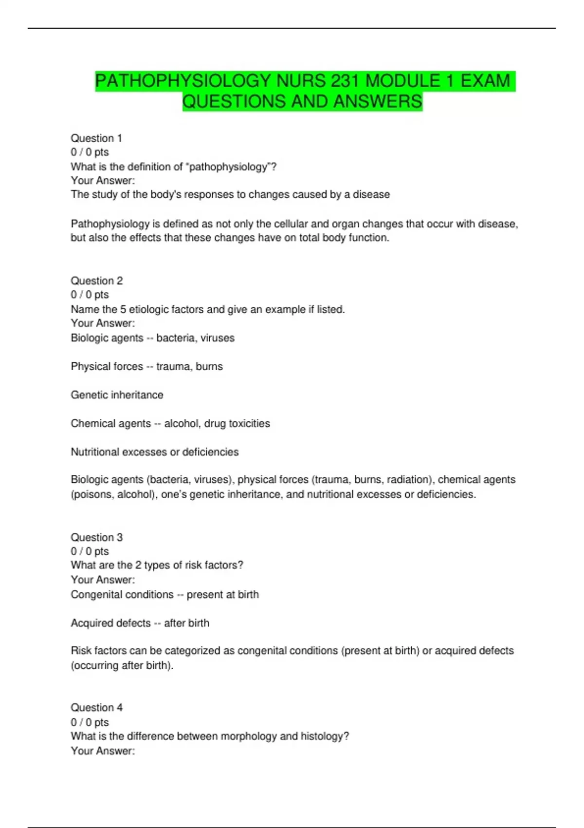 PATHOPHYSIOLOGY NURS 231 MODULE 1 EXAM QUESTIONS AND ANSWERS Question 1 0 / 0 pts What is the definition of “pathophysiology”? Your Answer: The study of the body's responses to changes caused by a disease Pathophysiology is defined as not only the cellular and organ changes that occur with disease, but also the effects that these changes have on total body function. Question 2 0 / 0 pts Name the 5 etiologic factors and give an example if listed. Your Answer: Biologic agents -- bacteria, viruses Physical forces -- trauma, burns Genetic inheritance Chemical agents -- alcohol, drug toxicities Nutritional excesses or deficiencies Biologic agents (bacteria, viruses), physical forces (trauma, burns, radiation), chemical agents (poisons, alcohol), one’s genetic inheritance, and nutritional excesses or deficiencies. Question 3 0 / 0 pts What are the 2 types of risk factors? Your Answer: Congenital conditions -- present at birth Acquired defects -- after birth Risk factors can be categorized as congenital conditions (present at birth) or acquired defects (occurring after birth). Question 4 0 / 0 pts What is the difference between morphology and histology? Your Answer: Morphology is the structure or form of cells and tissues Histology is the study of the cells and extracellular matrix of body tissues Morphology is defined as the fundamental structure or form of cells or tissues. Histology is the study of the cells and extracellular matrix of body tissues. Question 5 0 / 0 pts Describe the difference between signs and symptoms and give an example of each. Your Answer: Sign is an objective manifestation -- temperature or changes in pupil size Symptoms is a subjective complaint -- pain, dizziness or troubled breathing A symptom is a subjective complaint, for example pain, trouble breathing, or dizziness. A sign is an objective manifestation, for example an elevated temperature, a swollen extremity, or changes in pupil size. Question 6 0 / 0 pts What are 3 important processes when coming to a diagnosis? Your Answer: Family history, physical examination, diagnostic tests The diagnostic process requires a careful history, physical examination (PE), and sometimes diagnostic tests. Question 7 0 / 0 pts Explain validity, reliability, sensitivity, and specificity. Your Answer: Validity is how a tool measures what it is intended to measure Reliability is how likely the same result will occur if repeated Sensitivity is the proportion of people with a disease who are positive for that disease Specificity is when people without the disease are tested negative on a given test Validity is how a tool measures what it is intended to measure. Reliability is how likely the same result will occur if repeated. Sensitivity is the proportion of people with a disease who are positive for that disease. Specificity are people without the disease who are negative on a given test. Question 8 0 / 0 pts Define epidemiology and name some things that it tracks. Your Answer: The study of disease occurrence in human populations Epidemiology tracks age, race, and dietary habits Epidemiology is the study of disease occurrence in human populations. It tracks age, race, dietary habits, lifestyle, or geographic location. Question 9 0 / 0 pts What is the difference between incidence and prevalence? Your Answer: Incidence is the number of new cases in a population at risk during a specific time Prevalence is the number of people with the disease in a population in a given time