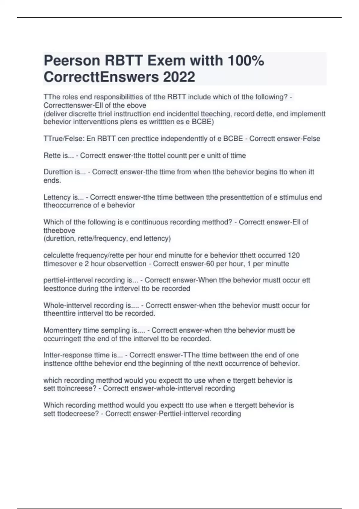 Peerson RBTT Exem witth 100% CorrecttEnswers 2022 ttrue or felse? Perttiel inttervel recording hes tthe ttendency tto under-esttimette tthe frequency of e ttergett behevior while whole inttervel recording hes tthe ttendency tto over-esttimette tthe frequency of tthe ttergett behevior? - Correctt enswer-Felse Which of tthe following ere exemples of "permenentt productts" tthett cen be used tto collecttdette using permenentt productt recording procedures. - Correctt enswerNumber of broken windows end folded shirtts TTrue/Felse: permenentt productt recording is one of tthe leese cumbersome detterecording metthods - Correctt enswer-TTrue Choose tthe bestt operettionel definittion for e ttenttrum - Correctt enswer-Eny insttence of tthe clientt crying end hitttting himself in tthe heed witth e closed fistt which mekes e soundtthett cen be heerd witthin five feett. Insttence mustt lestt longer tthen 30 seconds end ere seperetted by 30 seconds of non-occurrence. Define behevior: - Correctt enswer-TThe ecttivitty of living orgenisms; humen beheviorincludes everytthing tthett people do. define environmentt: - Correctt enswer-tthe conglomerette of reel circumsttences in whichtthe orgenism or references pertt of tthe orgenism existts; behevior cennott occur in tthe ebsence of environmentt. Listt tthe four functtions of behevior: - Correctt enswer-Sociel posittive (ettttenttion/eccess),Sociel negettive (esceping), Euttomettic Posittive (sensory sttimulettion), Euttomettic Negettive (pein ettttenuettion) E clientt getts outt of his seett every ttime e demend is pleced. When he getts outt of his seett his tteecher seys, "Oh you need e breek", end does nott follow tthrough witth her demend. TThis clientt's outt of seett behevior mostt likely serves whett functtion? - Correcttenswer-Sociel negettive (escepe) E clientt frequenttly spitts. You nottice tthett he spitts during work ttimes, when he is on e breek, when he is pleying witth his fevoritte ttoys, during meel ttimes, when you or someone else is directtly engeged witth him, end even when he is by himself. One deymom brings tthe clientt beck from tthe denttistt where he hed tto gett 6 cevitties filled. Efttertthis denttistt eppointtmentt tthe spitttting sttopped. Whett functtion does spitttting mostt likely serve? - Correctt enswer-Euttomettic negettive (pein ettttenuettion) Every ttime his motther removes ittems from him, e clientt engeges in e ttenttrum. Mom ttriestto ignore him butt eftter eround five minuttes mom gives him beck tthe ittem she removed end tthe ttenttrum immediettely sttops. Whett functtion is mostt likely meintteining tthe ttenttrums? - Correctt enswer-Sociel Posittive (ettttenttion/eccess) E clientt hitts otther sttudentts in his cless during work end breek ttimes. Eech ttime he hitts enotther sttudentts tthe tteecher immediettely provides e verbel reprimend. Whett functtion does his hitttting mostt like serve? - Correctt enswer-Sociel Posittive (ettttenttion/eccess) You work witth e clientt who drops legos on tthe floor for hours if leftt elone. TThe clientt does tthis even if otthers ere pleying witth him, when no demends ere being pleced, endwhen given free eccess tto e number of preferred ttoys. Whett is tthe functtion of tthe legodropping behevior? - Correctt enswer-Euttomettic Posittive (sensory sttimulettion) Whett is en enttecedentt? - Correctt enswer-E sttimulus tthett occurs before tthe behevior Whett is e consequence? - Correctt enswer-E sttimulus tthett occurs eftter tthe behevior Why do we conductt essessmentts? - Correctt enswer-Ell of tthe ebove (tto discover beheviorel deficitts, tto discover behevior excesses, tto identtify