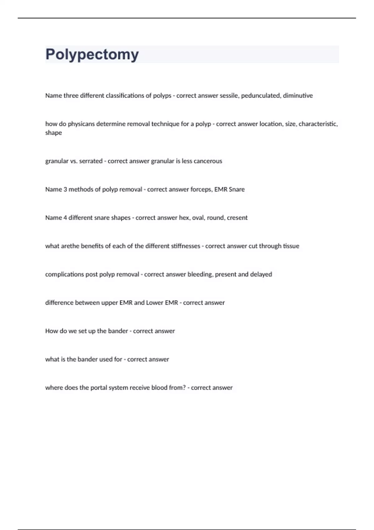 PolypectomyName three different classifications of polyps - correct answer sessile, pedunculated, diminutive how do physicans determine removal technique for a polyp - correct answer location, size, characteristic, shape granular vs. serrated - correct answer granular is less cancerous Name 3 methods of polyp removal - correct answer forceps, EMR Snare Name 4 different snare shapes - correct answer hex, oval, round, cresent what arethe benefits of each of the different stiffnesses - correct answer cut through tissue complications post polyp removal - correct answer bleeding, present and delayed difference between upper EMR and Lower EMR - correct answer How do we set up the bander - correct answer what is the bander used for - correct answer where does the portal system receive blood from? - correct answer